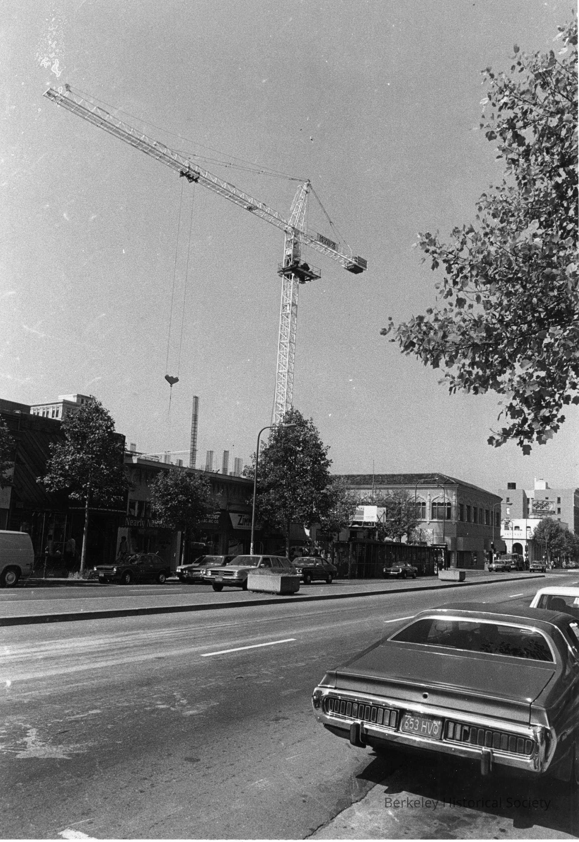 Shattuck Ave near University Ave. lookin S. Construction crane; autos.