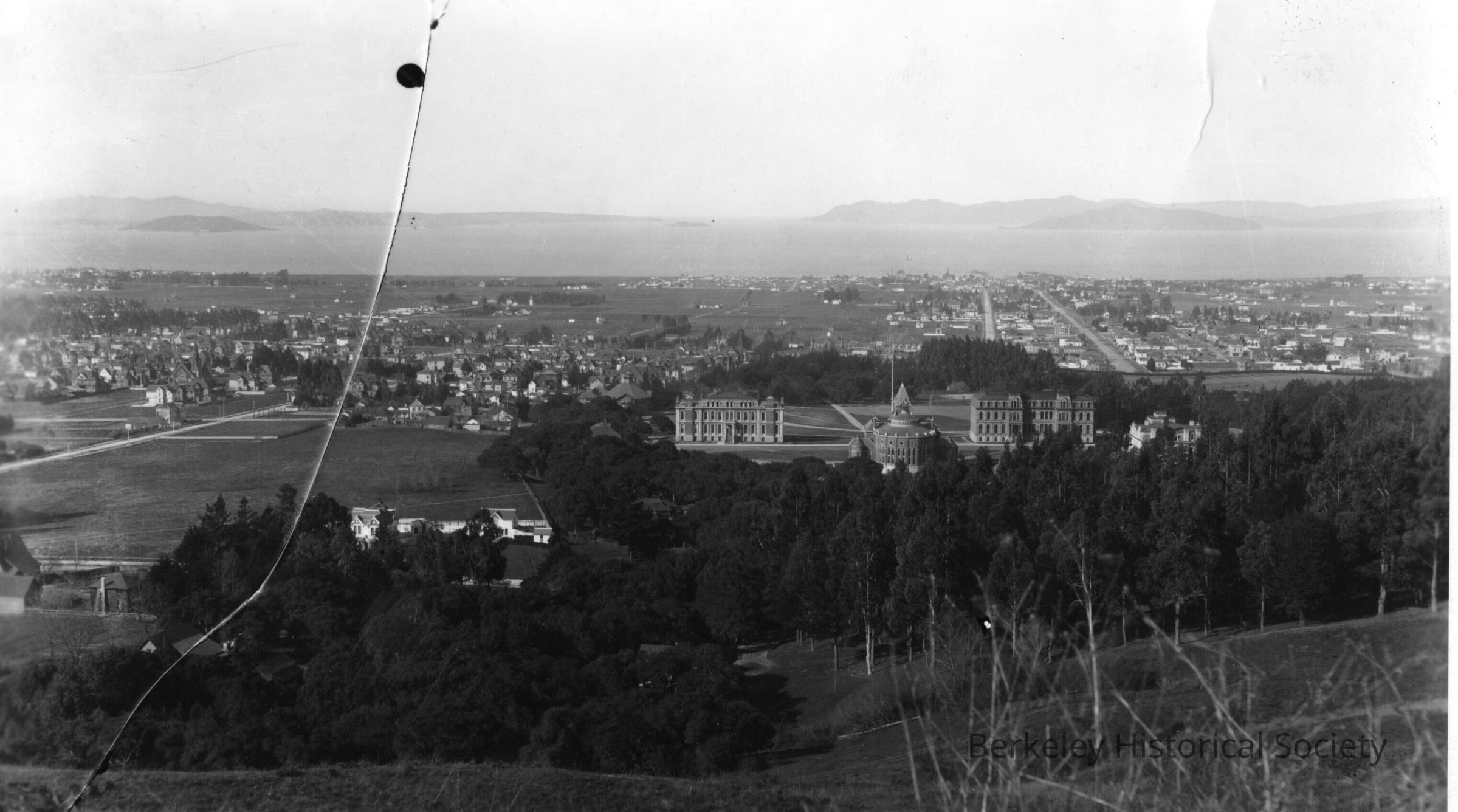 University of California campus; view extends to bay with houses and empty land.