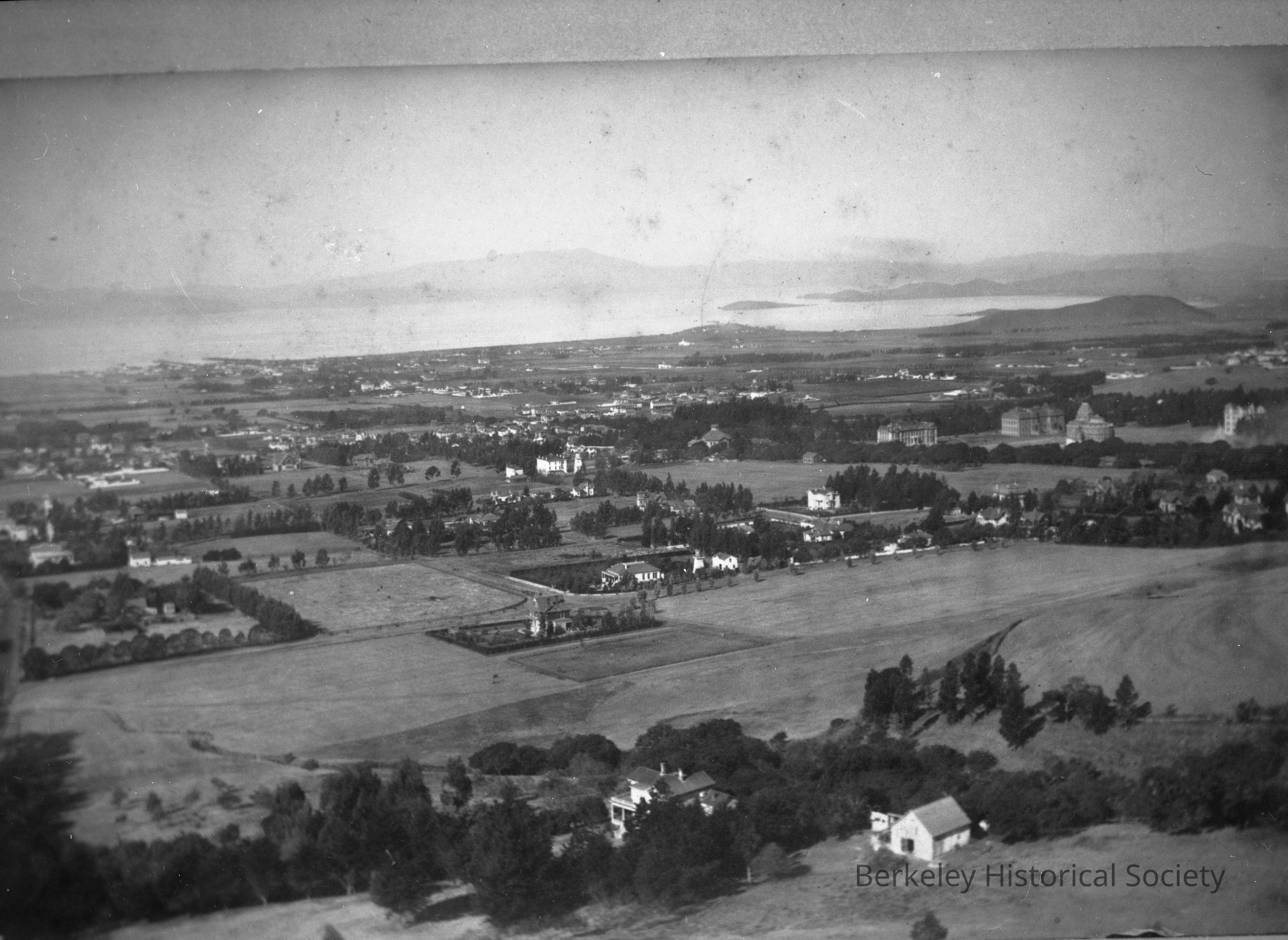 Scattered houses, agricultural fields, University of California buildings at right.