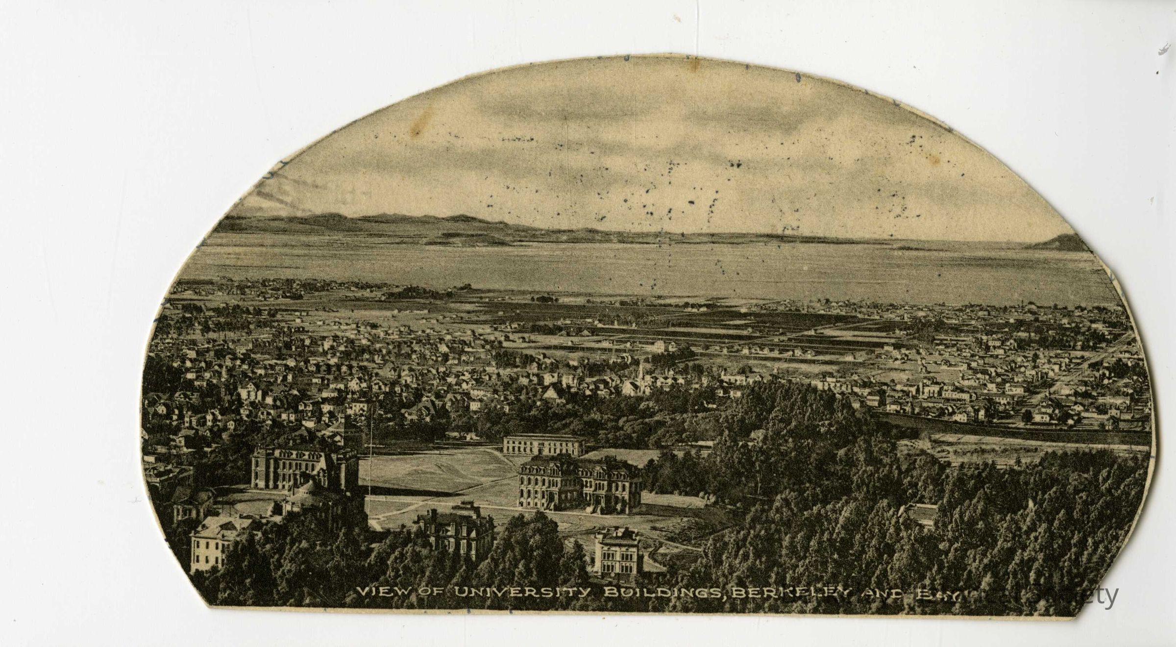 Black and white image of UC Berkeley from above with bay in distance. This postcard has been trimmed into an oval with a flat bottom.