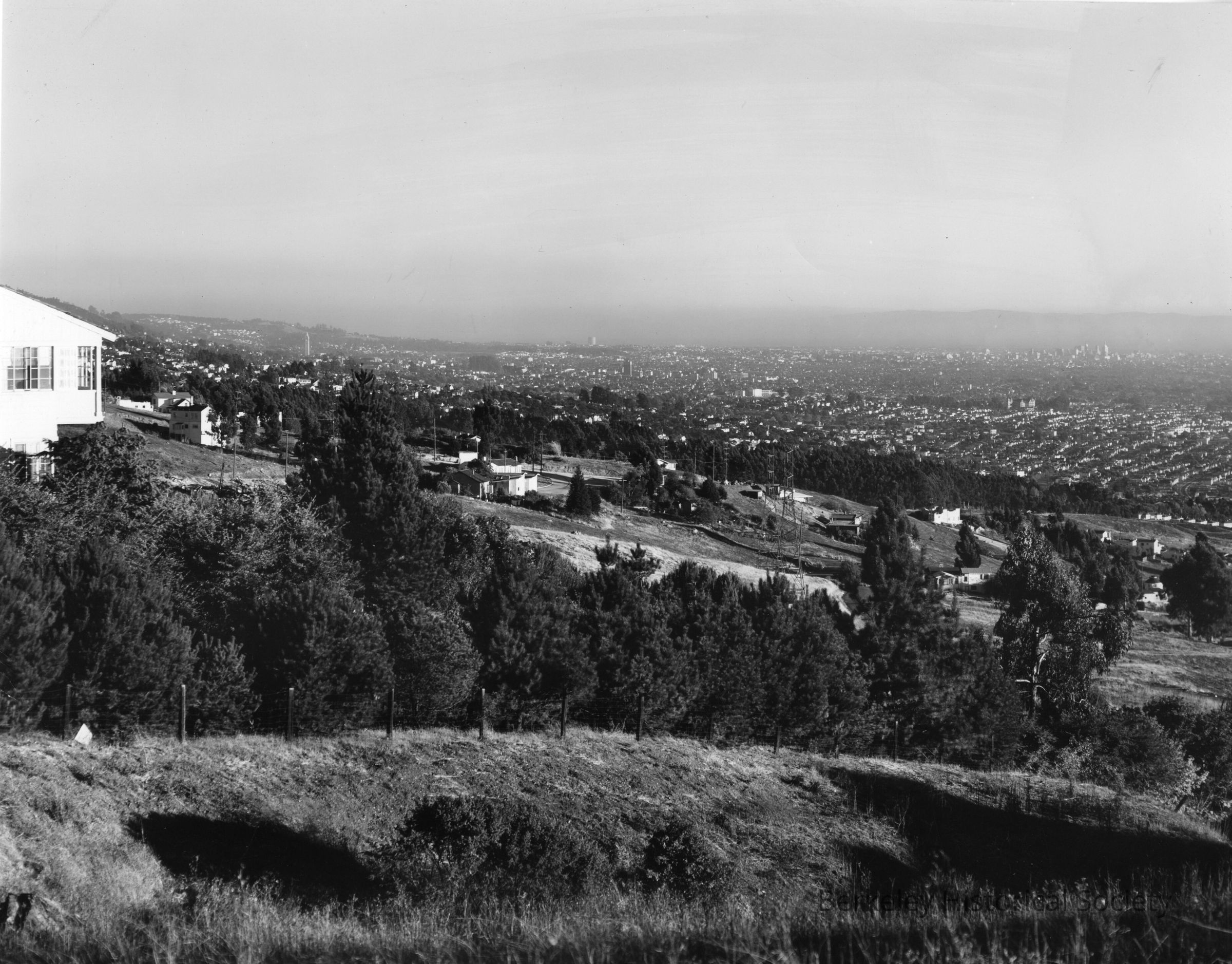 View from hills near Arlington and Terrace. Part of one house visible to left, Campanile in the distance.
