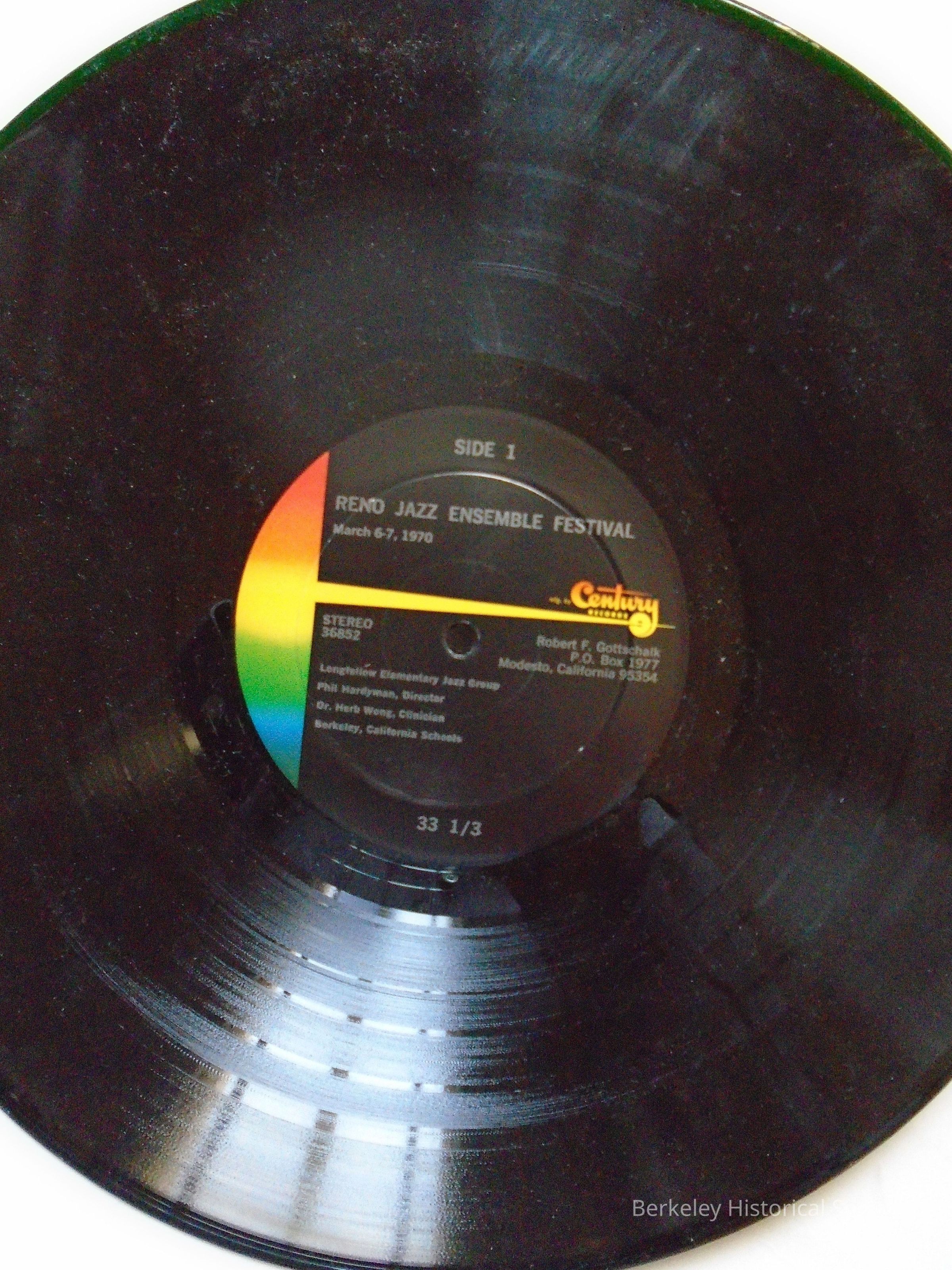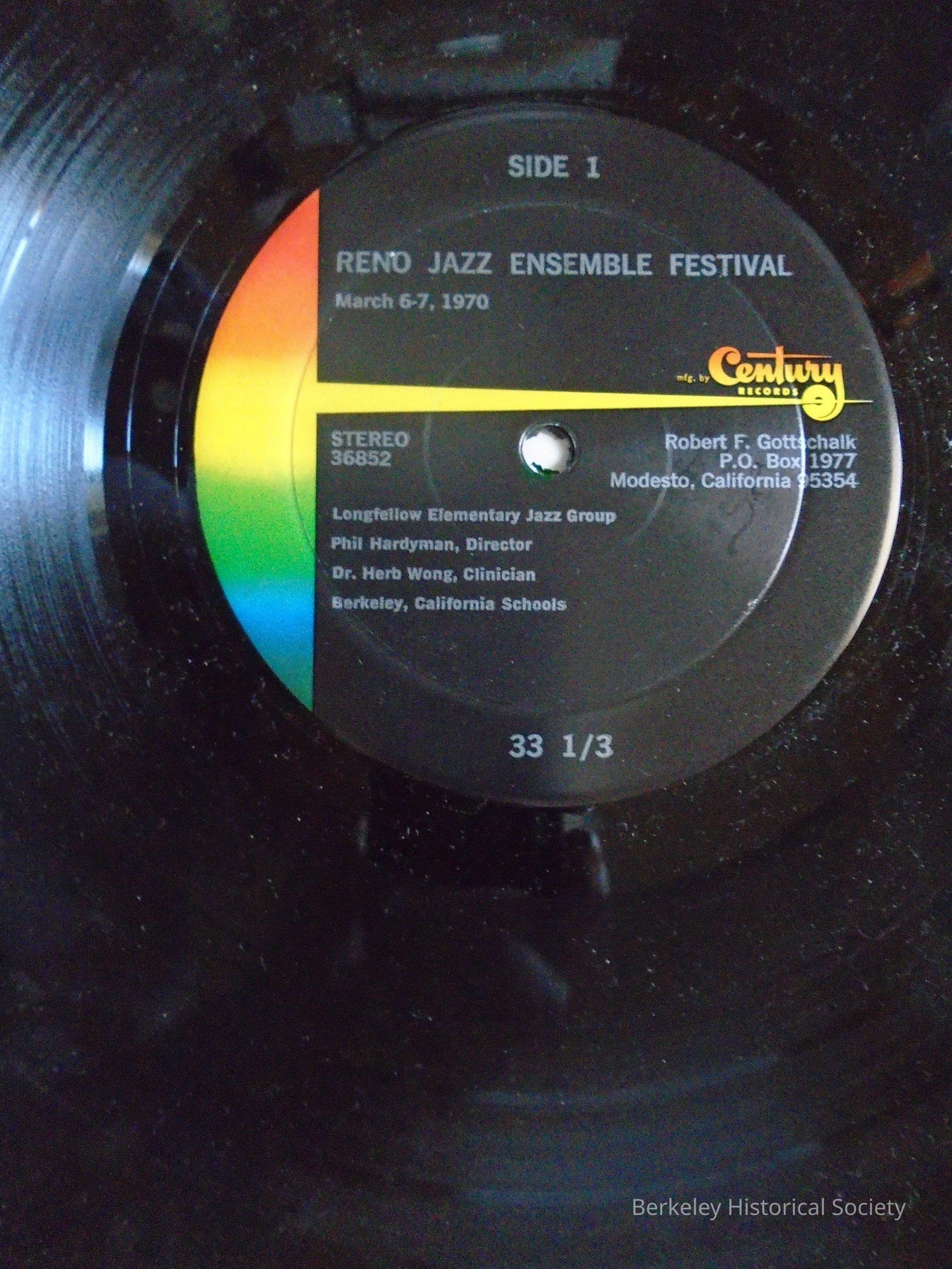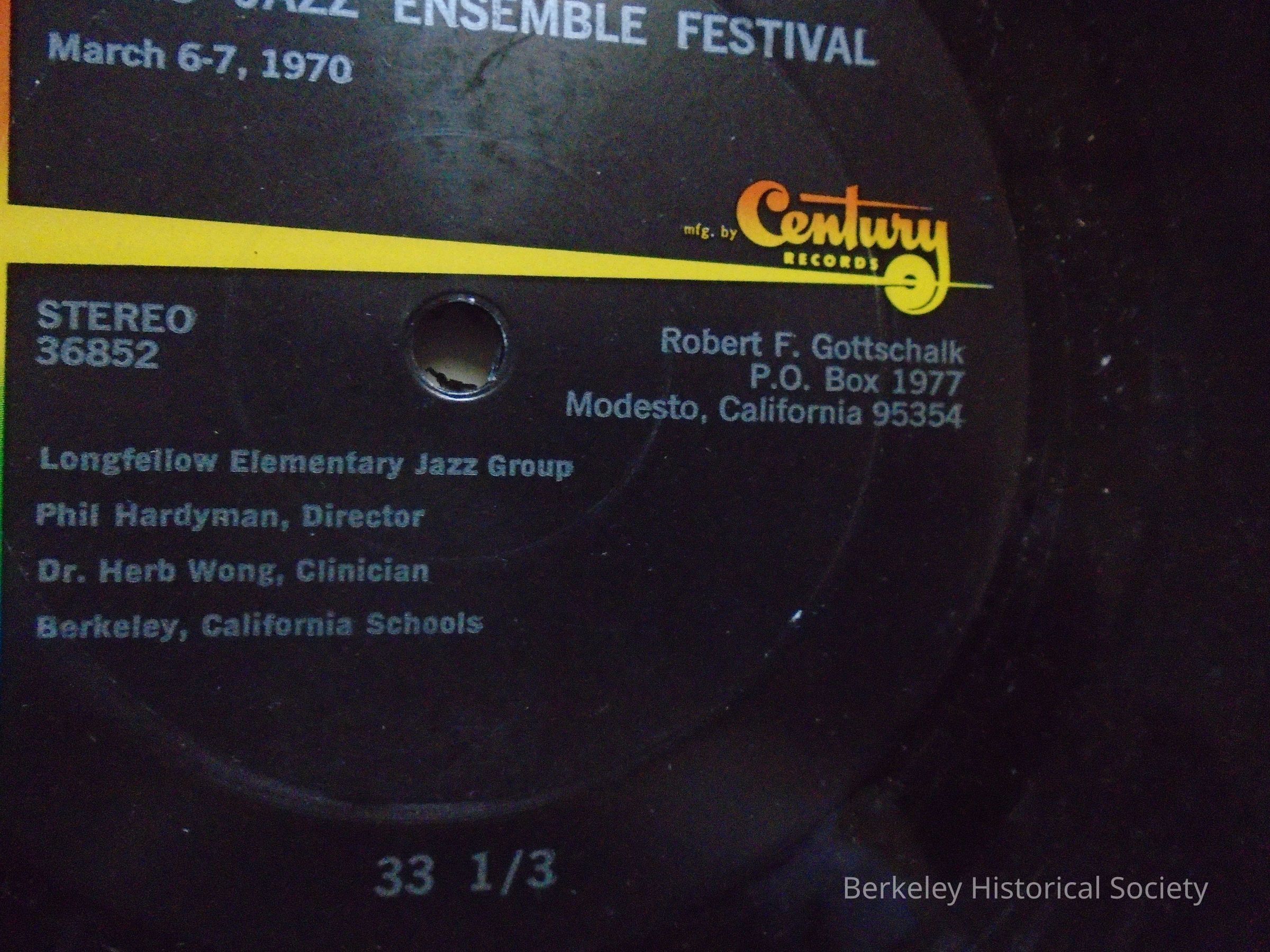 Vinyl record Title: Reno Jazz Ensemble Festival, March 6-7, 1970. Group recorded: Longfellow Elementary Jazz Group, Phil Hardyman, Director, Dr. Herb Wong, Clinician, Berkeley, California Schools. 33 1/3. Label on side 2 is the same as side 1. White cardboard cover showing simple diagram of the Century Records office and factory.Dimensions