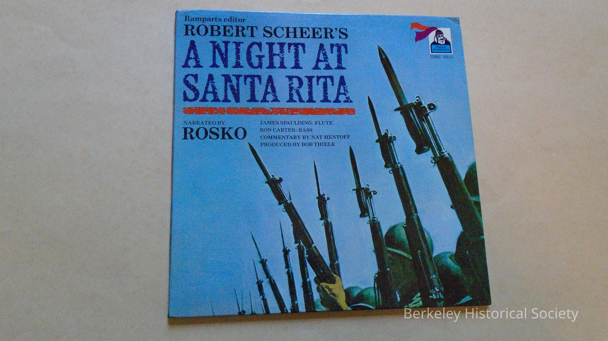 Vinyl record, L.P.(33 1/3 rpm) "A Night at Santa Rita" in a cardboard folder cover. Copyright 1969 by Flying Dutchman Productions. Rbt Scheer's (editor of Rampart's Magazine) account of a night in Santa Rita jail read by Bill "Rosko" Mercer after he was arrested in the Berkeley People's Park protest, 1969. Covers freedom of speech, prison brutality. Rbt Scheer lived near People's Park and was a candidate for Congress in the Berkeley/Oakland community in 1966 (received 45% of vote). Music by James Spaulding, flute and Ron Carter, bass.Lexicon