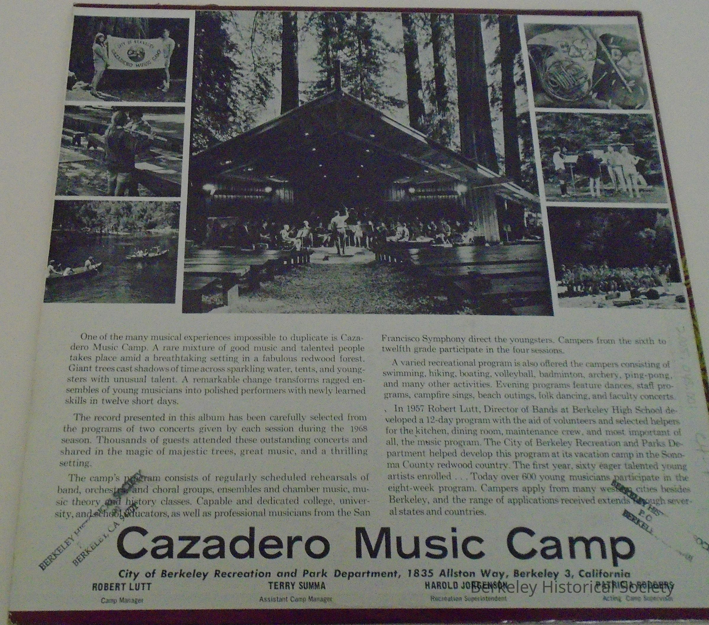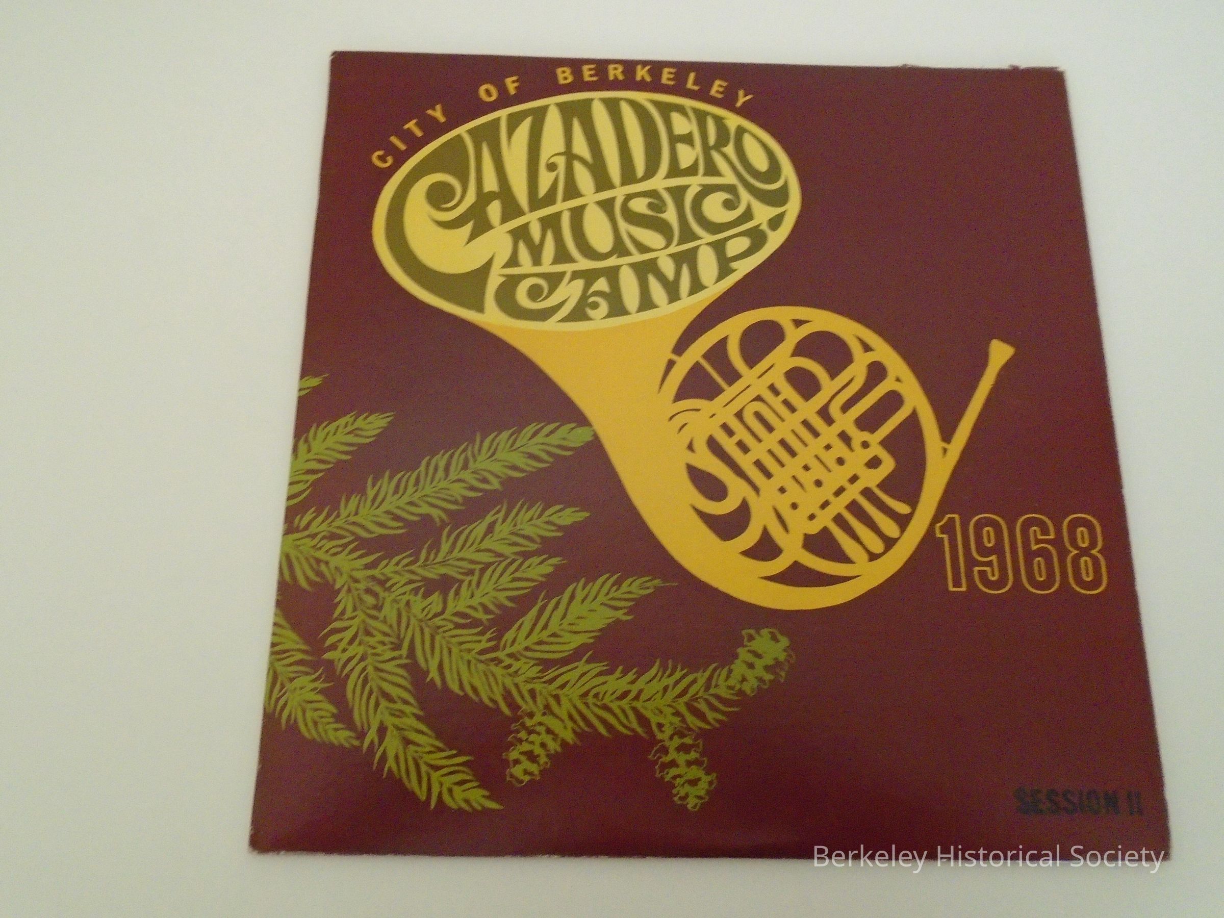 Vinyl LP record of City of Berkeley, Cazadero Music Camp, 1968. Includes Band, Choir and orchestra music. Album cover is brown with a gold French Horn on front. Pictures of camp on the back.Lexicon