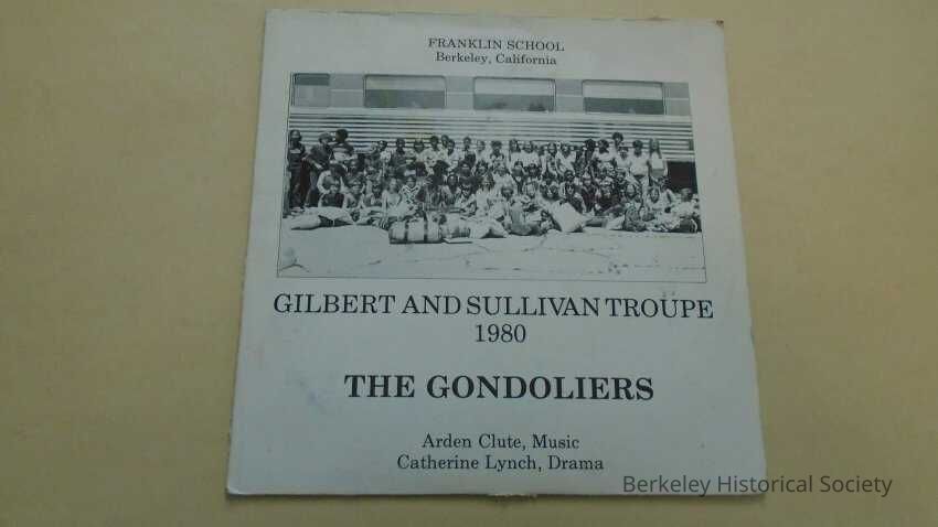 Vinyl phonograph record in cardboard jacket : Recording of Franklin High School, Gilbert and Sullivan Troupe 1980 "The Gondoliers". Arden Clute, Music and Catherine Lynch, Drama. Cover has black and white photograph of the troupe sitting in front of a train.Lexicon