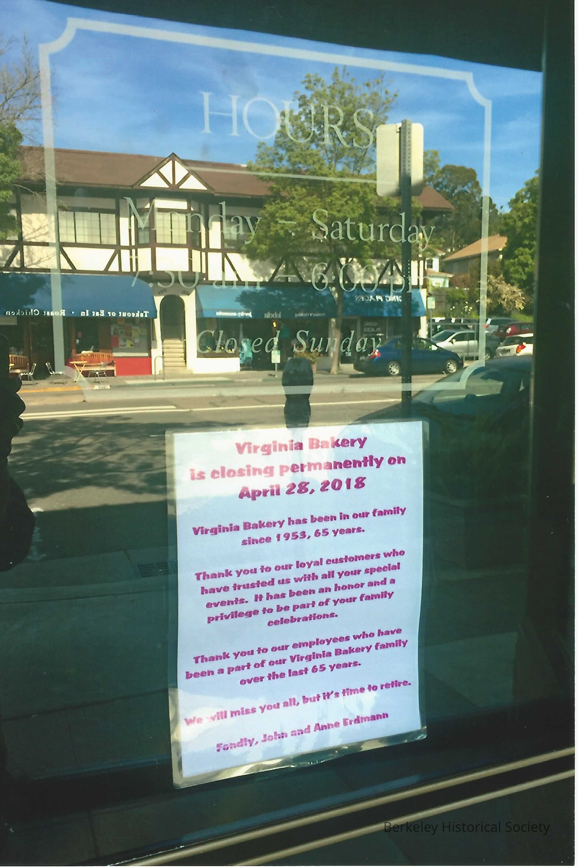 John Underhill, photog. Exterior window with announcement of closing; reflection of building across street.
