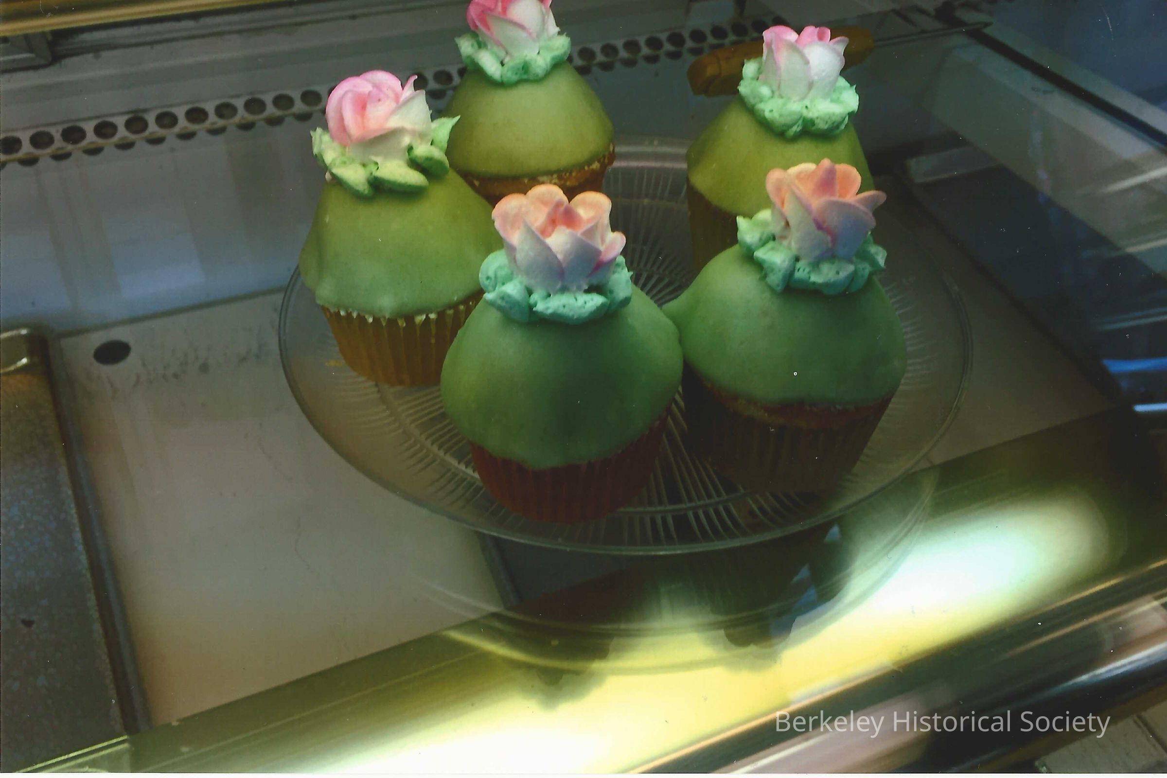 John Underhill, photog. Five pastries with green marzipan and flower on top.
