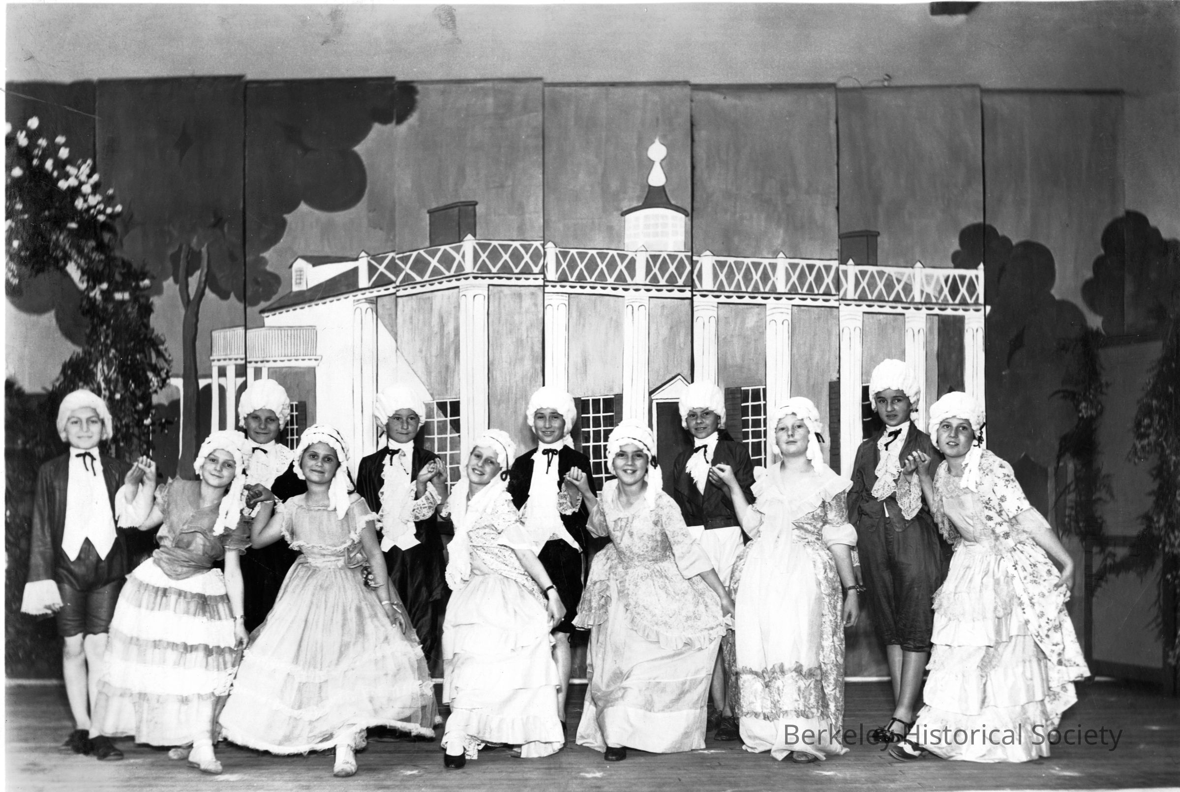 Students in fancy dress simulating dance in early republic era; painted backdrop of grand house.Other Names and Numbers