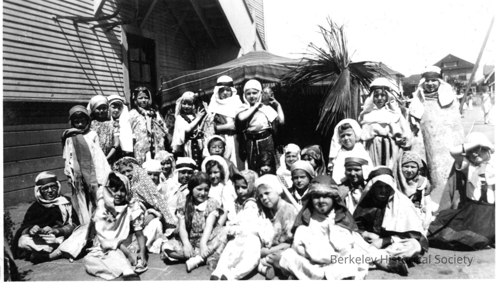 Large groups of students in Arabian costumes outdoors, with tent.Other Names and Numbers