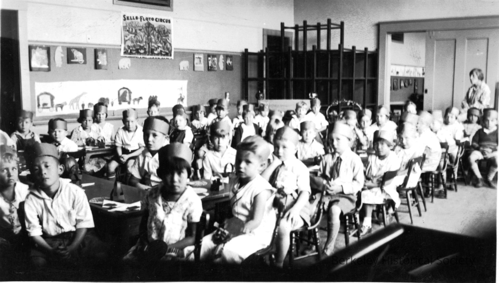 Kindergarten class party; all in paper caps. Seated turned toward photographer.Other Names and Numbers