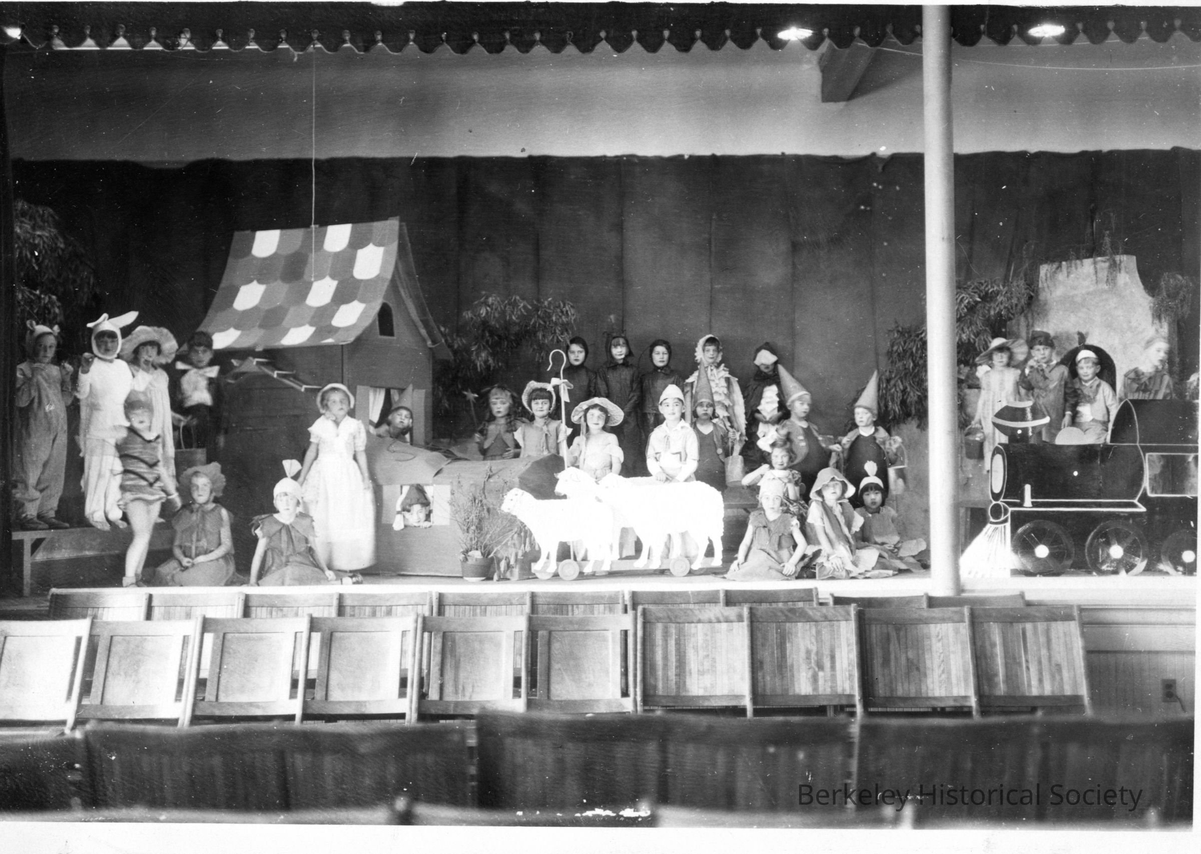 Students on play on stage; some Mother Goose themes, train at right, two students in dunce caps, and more.Other Names and Numbers