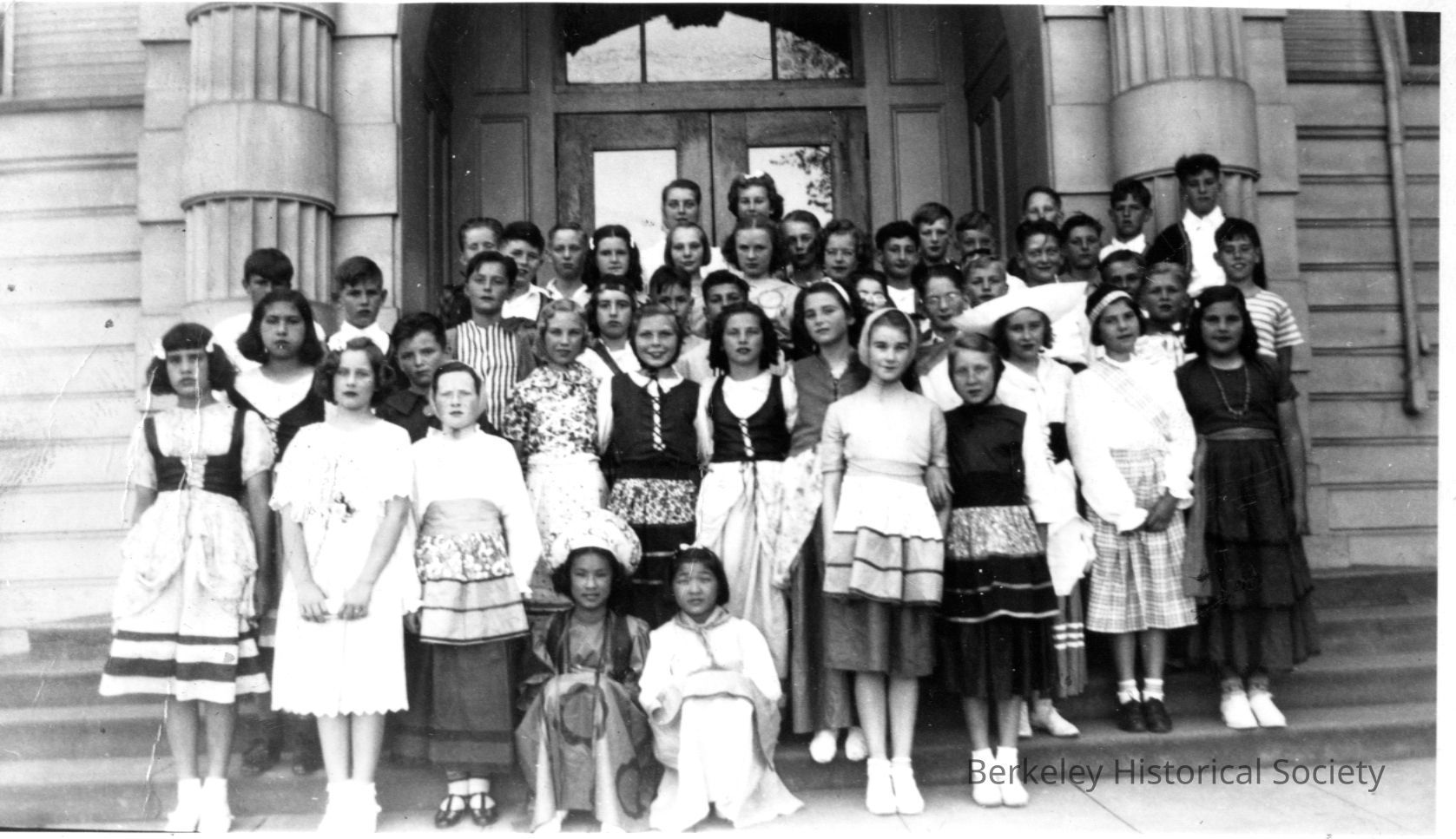 Students on steps of school, in costumes representing various cultures, mainly European, with two Asian in front.Other Names and Numbers
