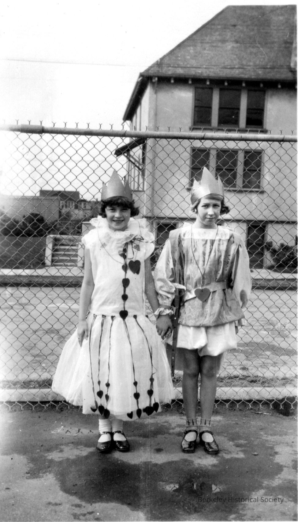 Two children in schoolyard in costume with paper crowns.Other Names and Numbers