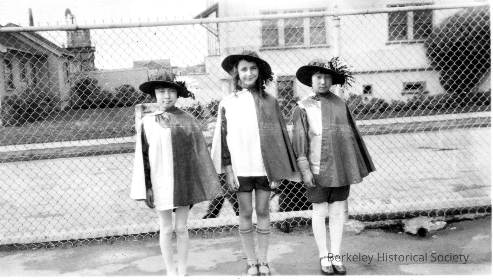 Three school girls in costume -- capes with broad brim hats. In background, across the street behind a house is a tank house with windmill.Other Names and Numbers