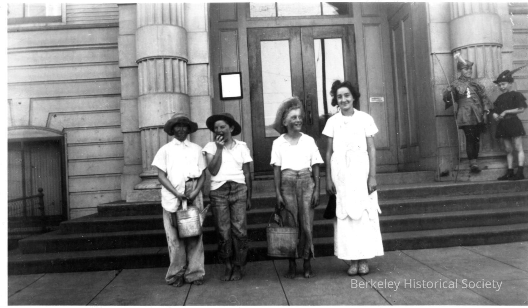 Four students dressed in dirty clothes; in background to right two students in 'Robin Hood' costumes.Other Names and Numbers