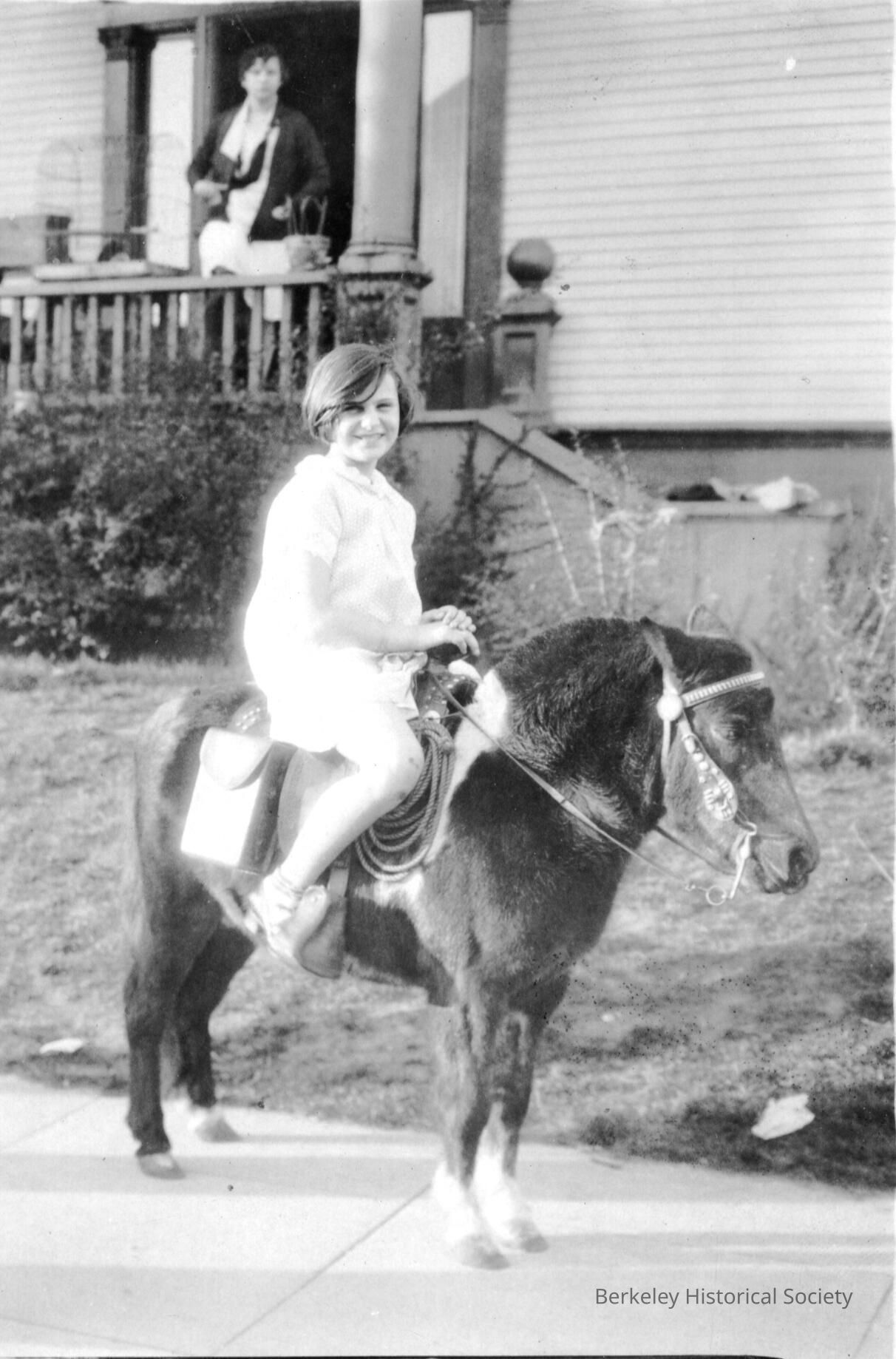 Girl on pony. For a pet show? Woman on porch in background.Other Names and Numbers