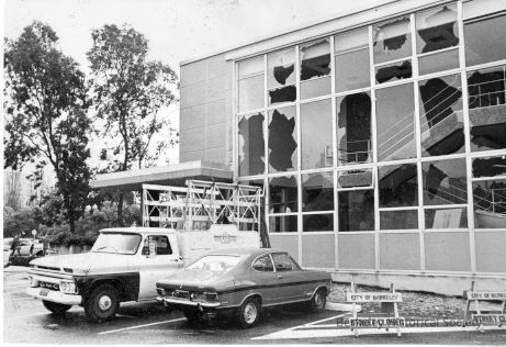 Riot damage showing many broken windows.