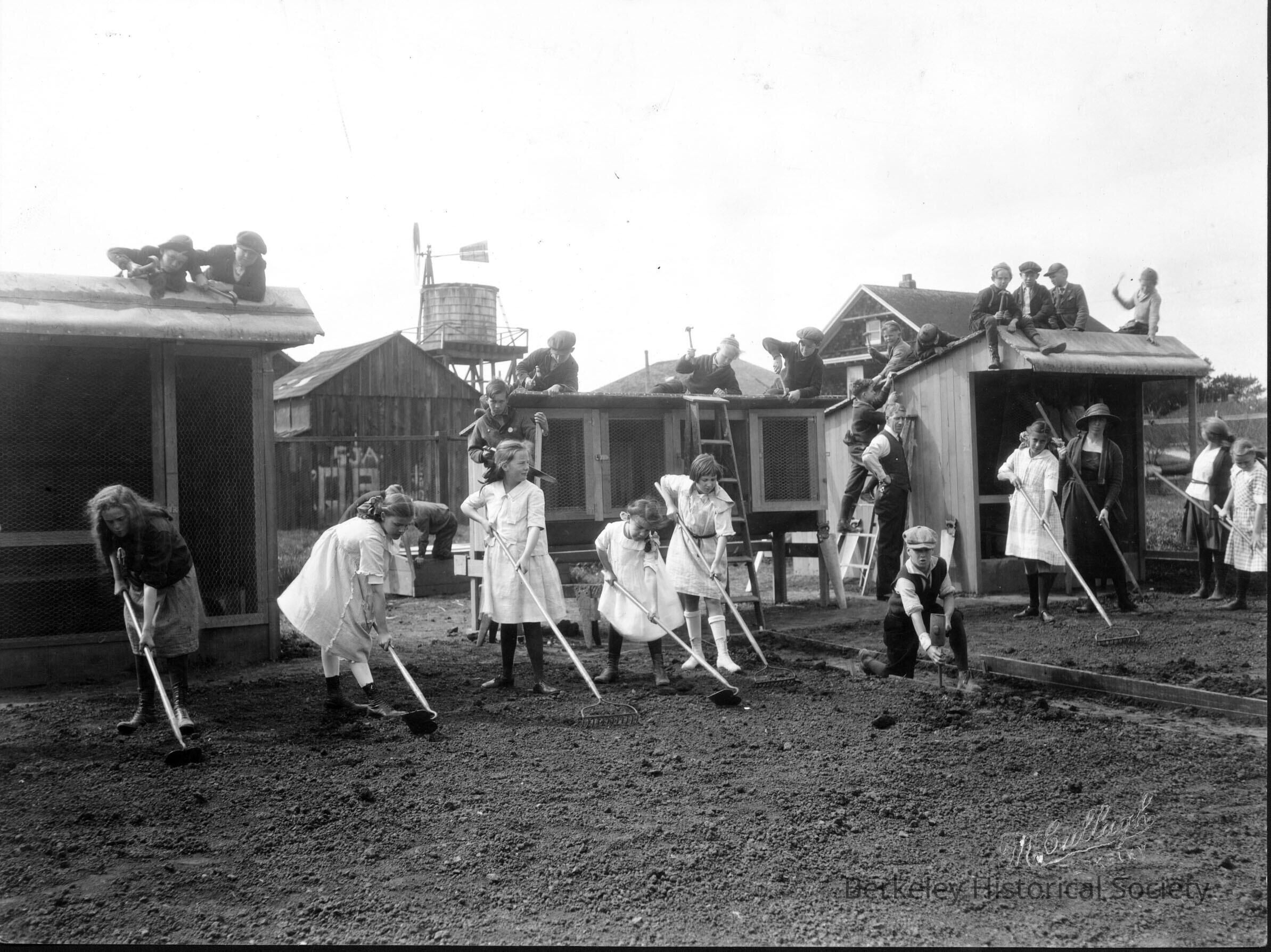 Girl students posing with hoes and rakes in the garden; boys with hammers on roofs of small buildings; one boy with saw; two adults.Other Names and Numbers