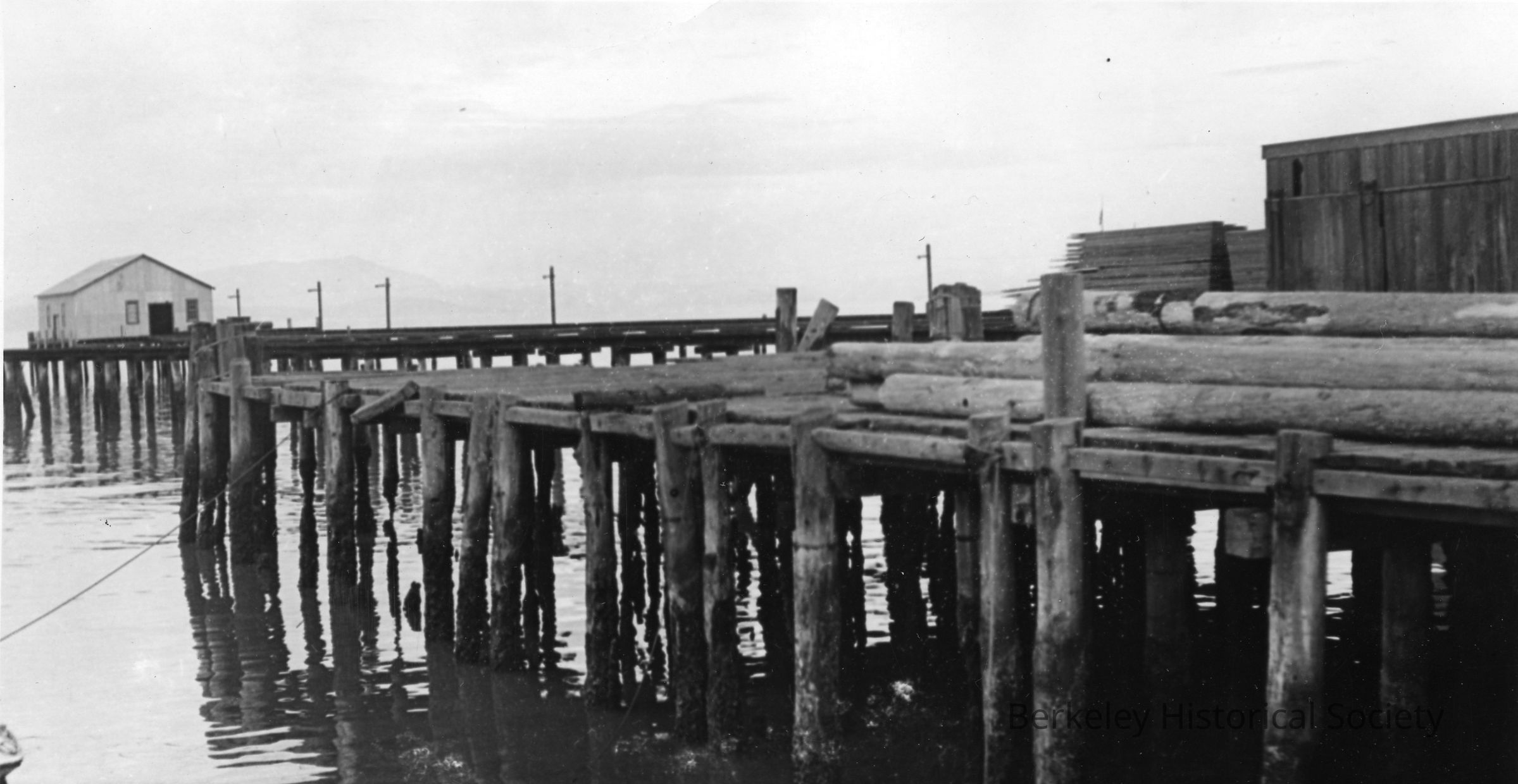 Wharf; structure visible at far end; close up of pilings in foreground.