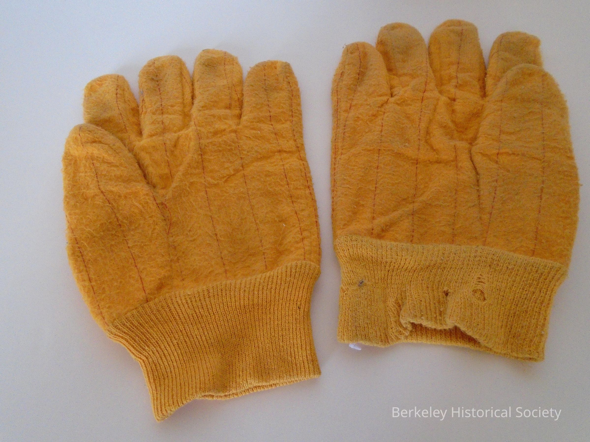 Large, men's, bright gold cotton gloves. The gloves were worn by Joseph Charles ( "Mr. Charles") as he waved to cars at the intersection of Martin Luther King Jr. Way & Oregon St. He usually was at his post at the morning commute time from around 1962 to 1992 and was known as Berkeley's "Waving Man". He always had a smile and a Have a Good Day attitude. He passed away in 2002. There is a mural honoring him at MLK Way and Ashby Ave.Made/Created
