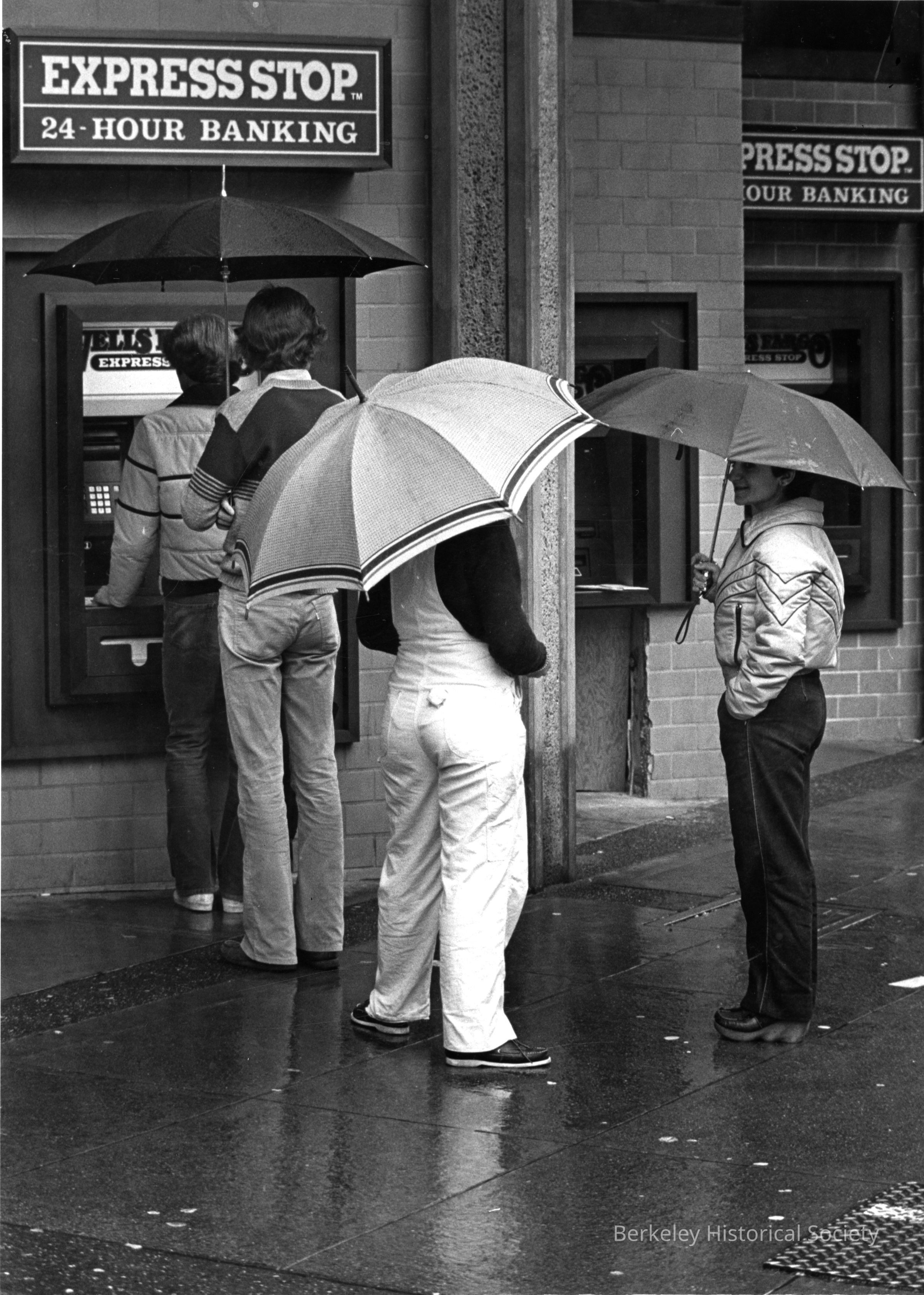 People lined up at ATM on Bancroft Way in the rain, most with umbrellas.Other Names and Numbers