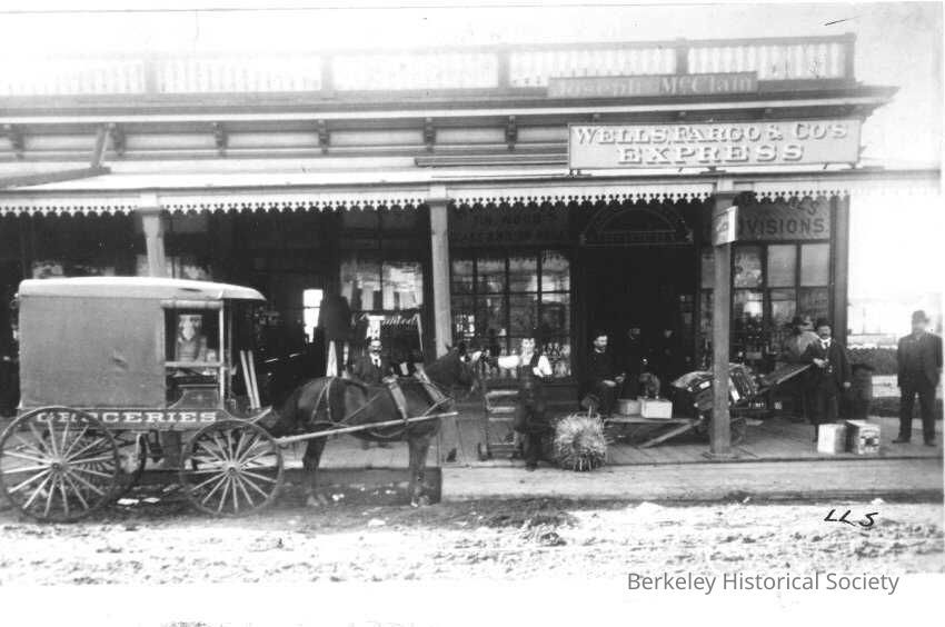 Wells Fargo Express office, Joseph McClain Co., 1890. Grocery cart in front of building.