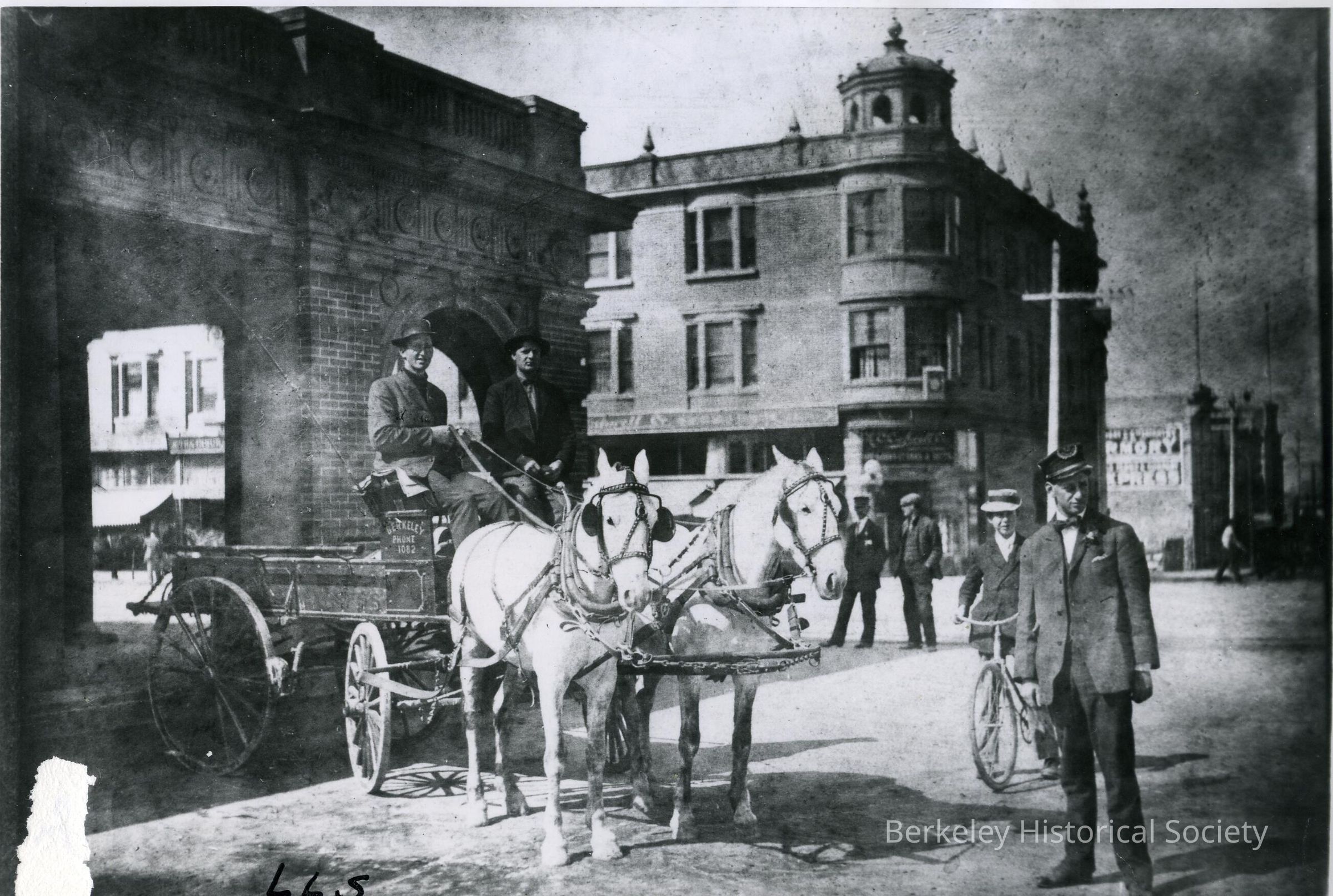 2034 Addison Street. Horse team and wagon; woman on bicycle.
