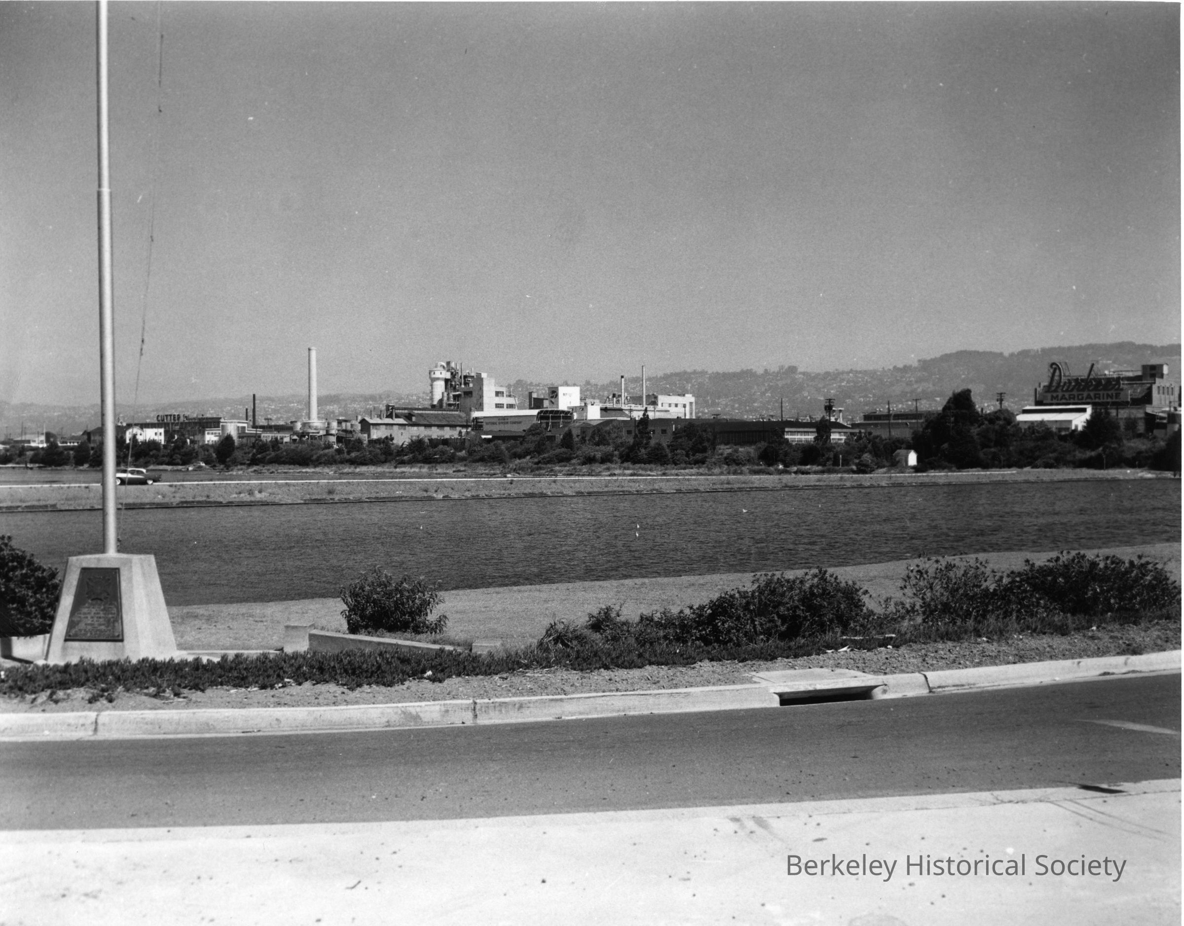 View across Aquatic Park to industrial buildings, hills in distance.