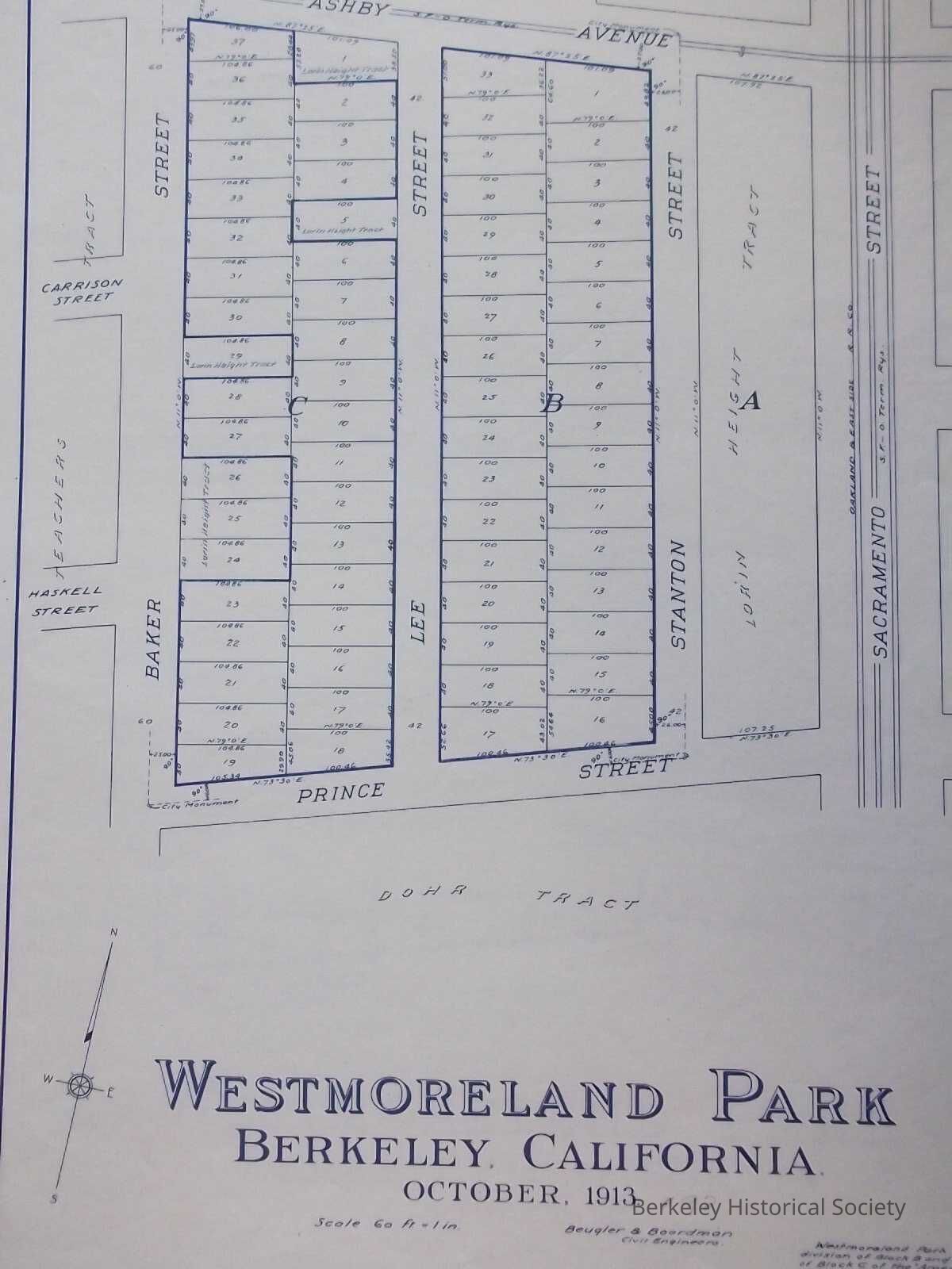 Tract Map. south of Ashby west of Sacramento, Adjacent to Teachers Tract, Mountain View Tract, Portion of plot 55, V&D Peralta Ranch, Lorin Heights Tract, Dohr Tract. Westmoreland Park is a resubdivision of a portion of block B and a portion of block C of the 'Amended map of the Lorin Height Tract' etc., filed Sept. 22, 1890 in the office of the Recorder of Alameda County, Cal.