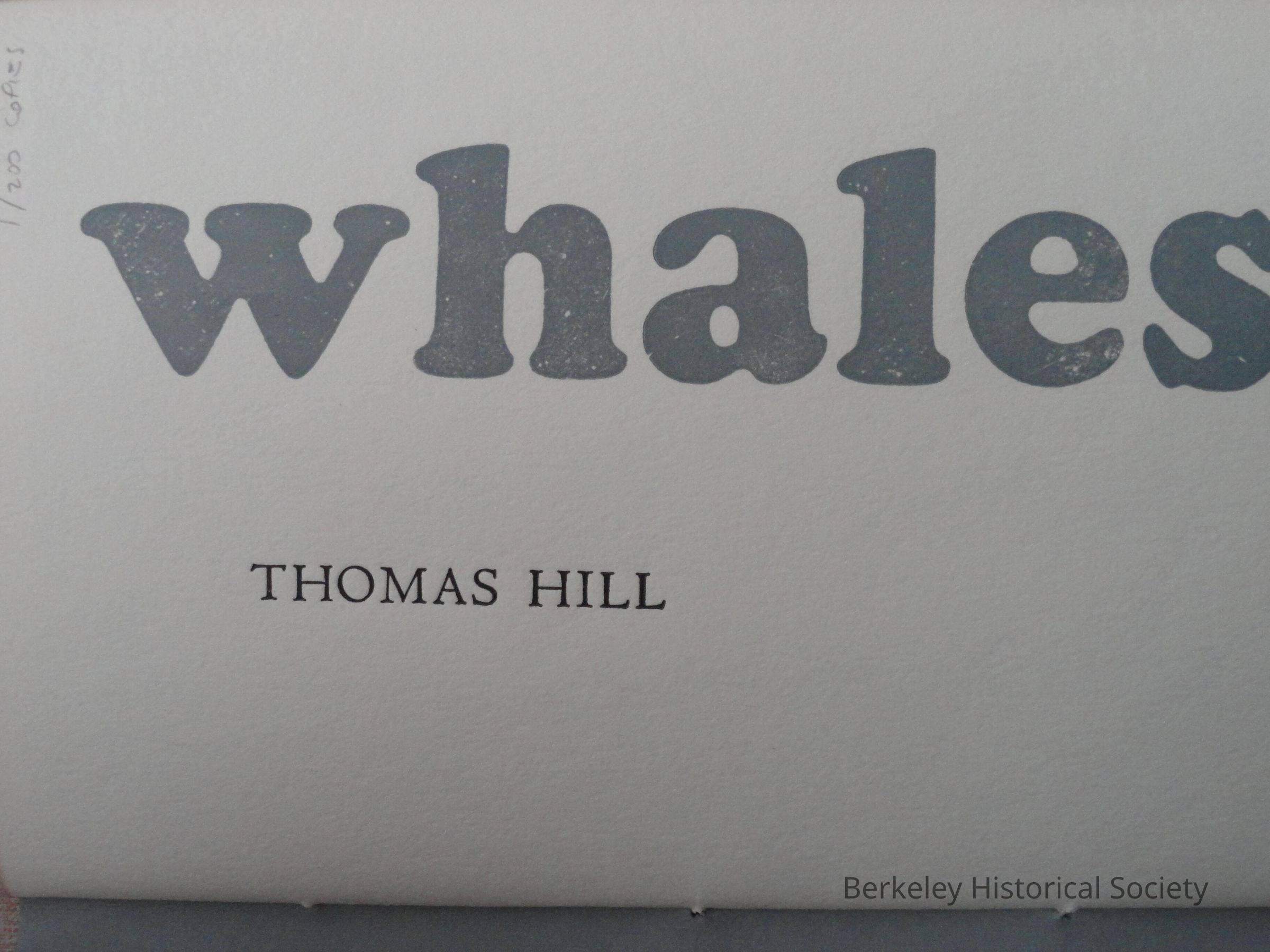 Hill, Thomas; WHALES ; poems "an edition of 200 copiess." 8 p., 1 l. 23 cm.