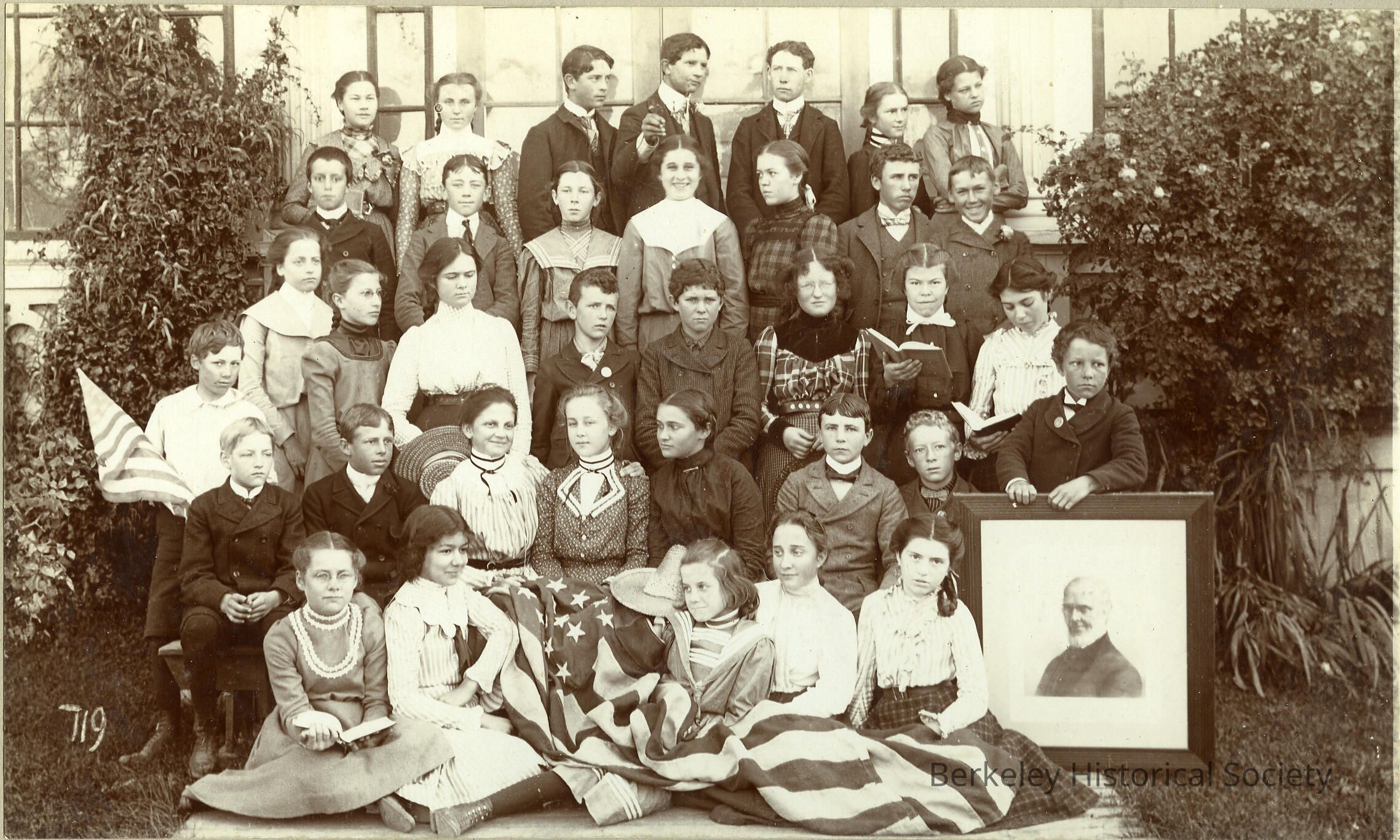 Class with U.S. flag draped on the first row, a student stands and carries the portrait of John Greenleaf Whittier (possibly Allston Way School)Made/Created