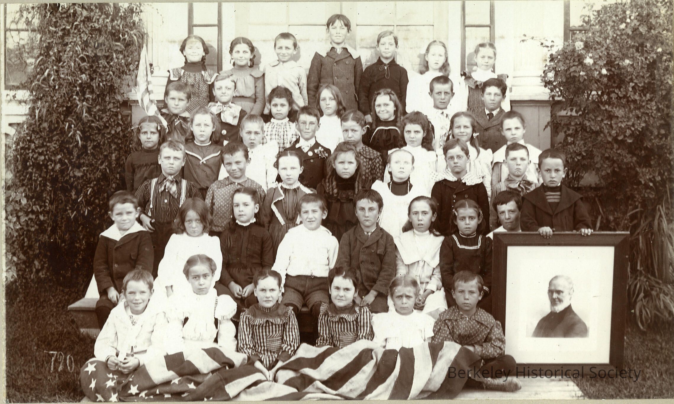 Class with the American flag draped on all the kids on the first row, two twin girls on the first row, a standing student on the second row carries a portrait of John Greenleaf Whittier (possibly Allston Way School)Made/Created
