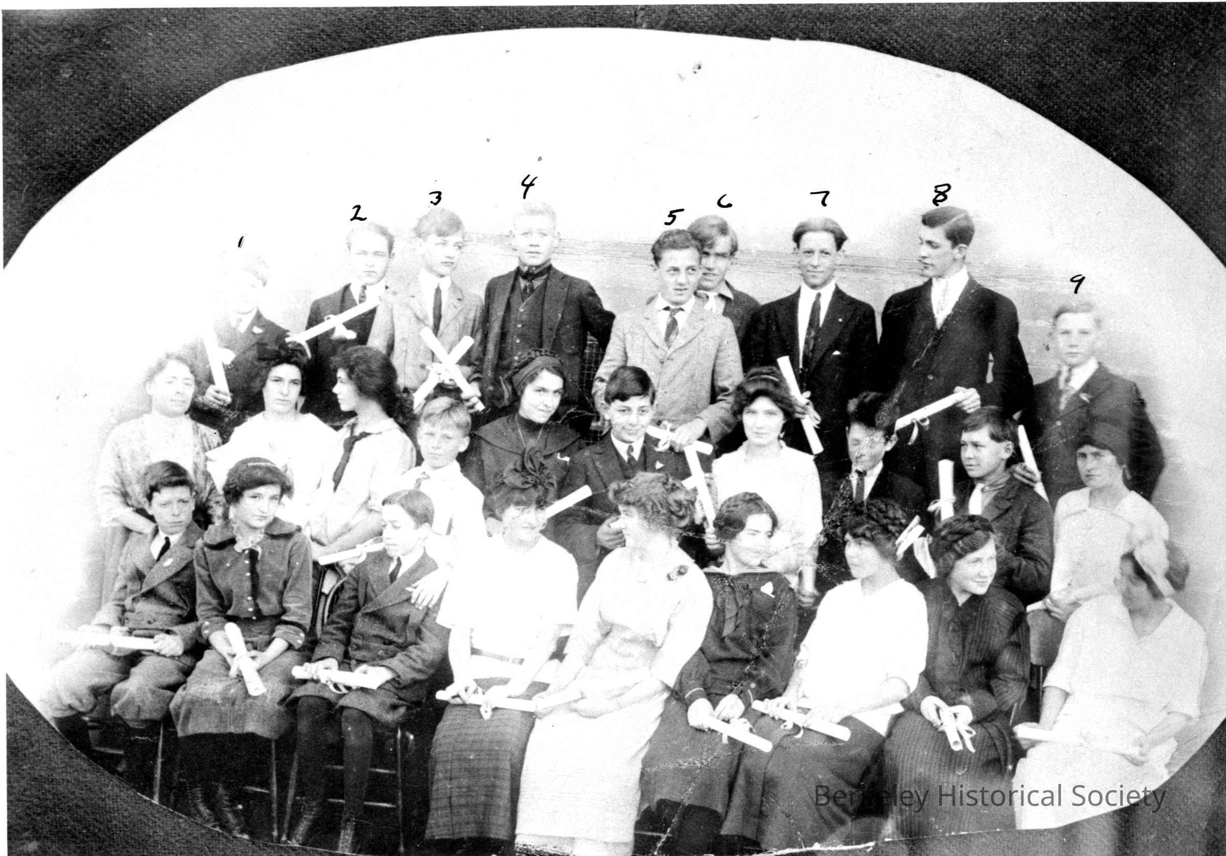 Eighth grade graduating class; students with rolled diplomas in hand. Harriet Grover, teacher. Some numbers on photo for identification. Hand cut oval frame.Other Names and Numbers