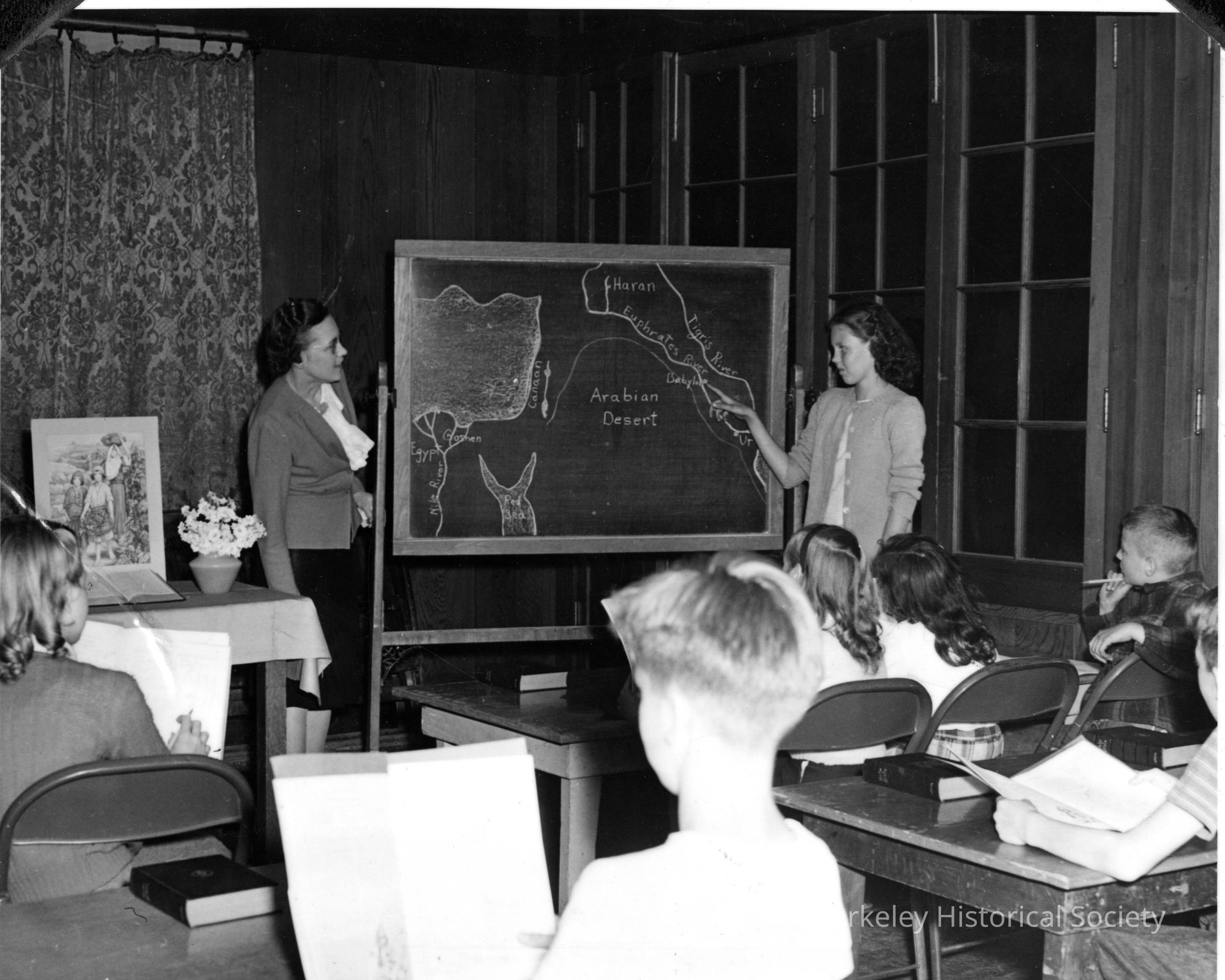 Class studying map of Middle East on blackboard; one student standing by blackboard, pointing to particular area; teacher to left of blackboard.Other Names and Numbers