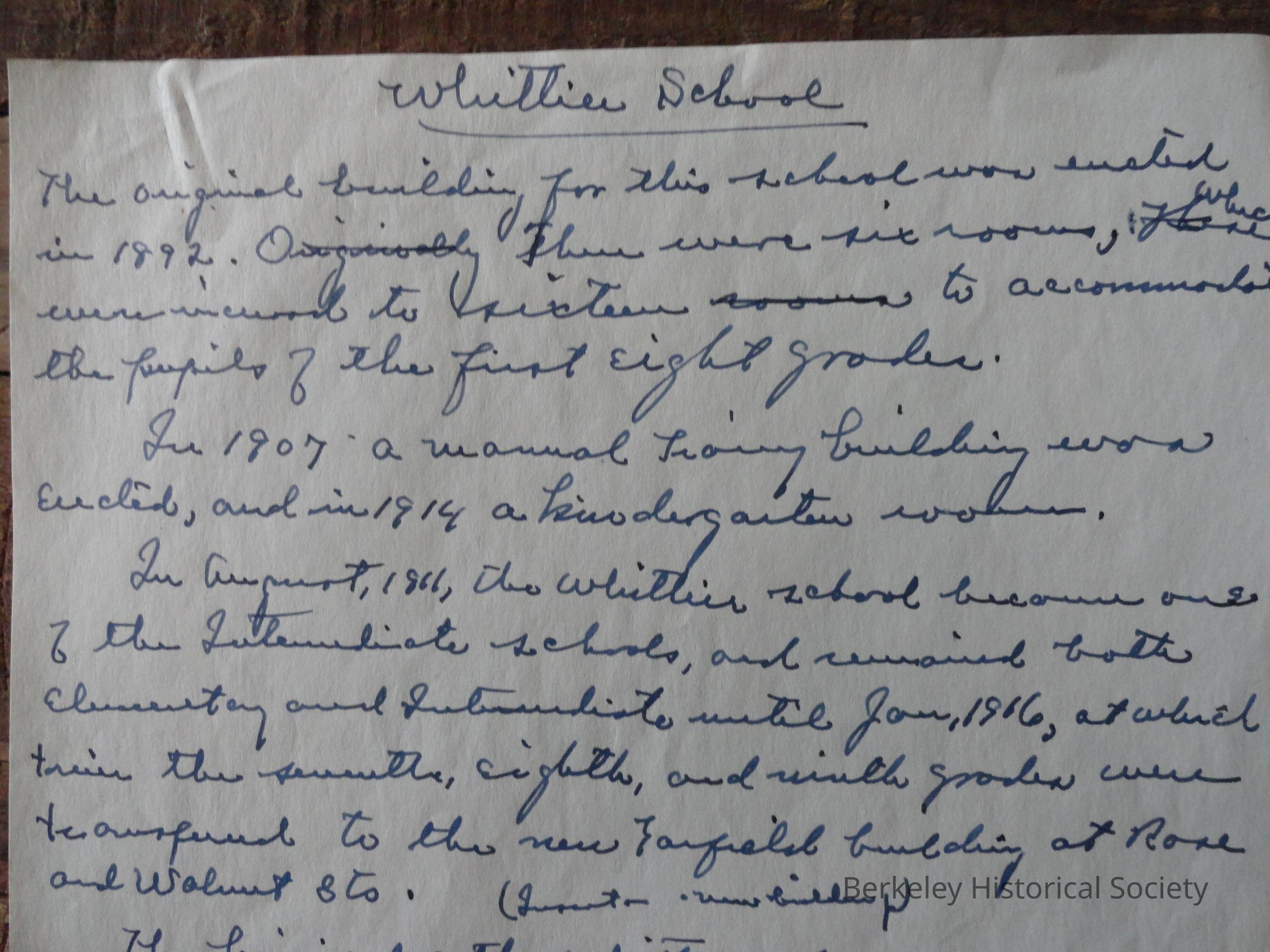 Paper files include history, material on the buildings, procedures manuals and school descriptions, student writings, 1932 reunion correspondence, etc., mainly drawn from uncataloged materials in Berkeley Schools collection.