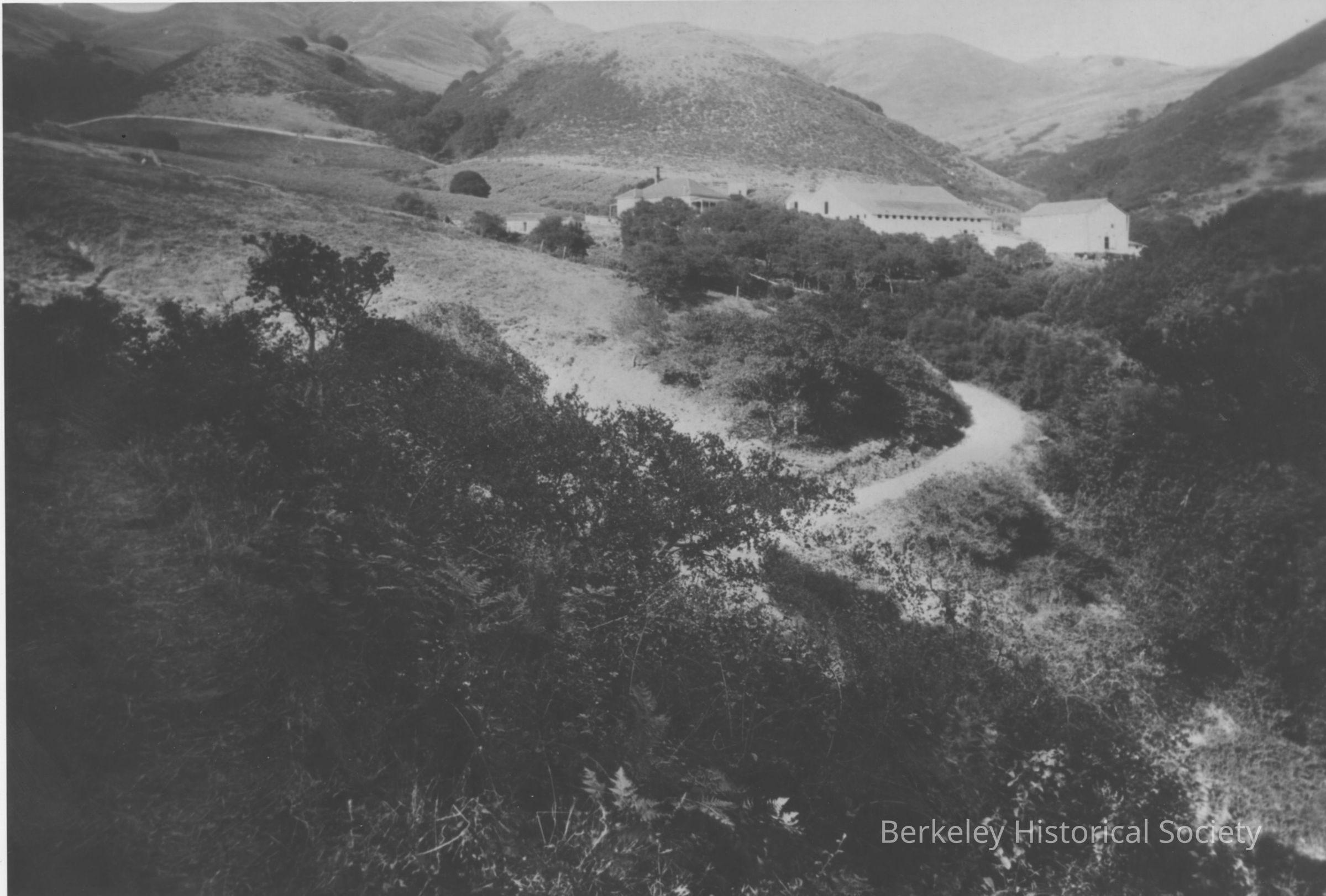 View of canyon, with road and partial view of buildings of Such Dairy.