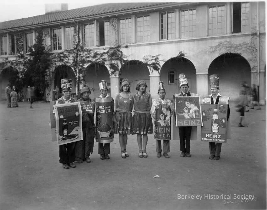 Eight students in front of school building, male students wearing signs for Heinz products.