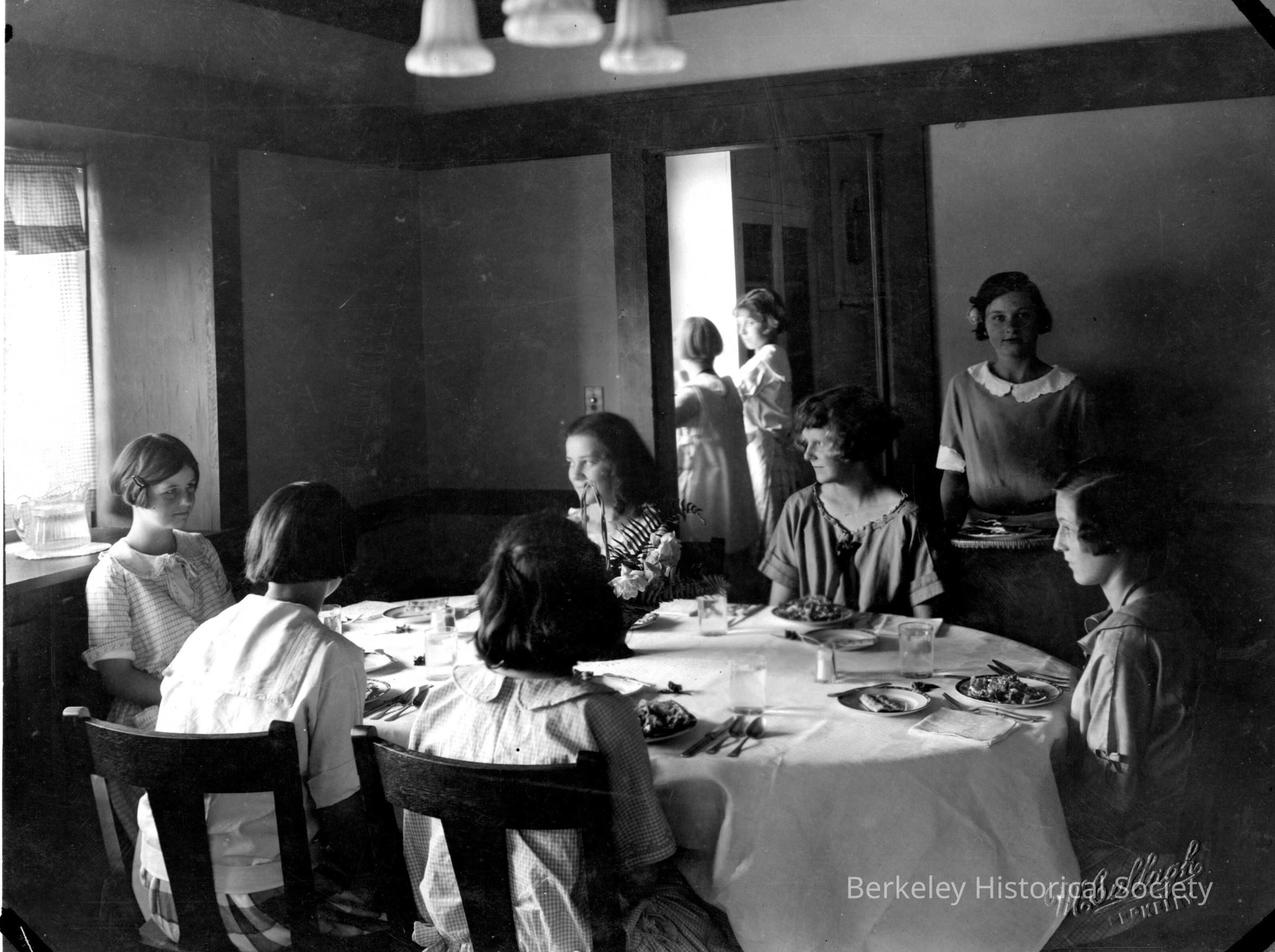 Women students at dining table, being served by another student