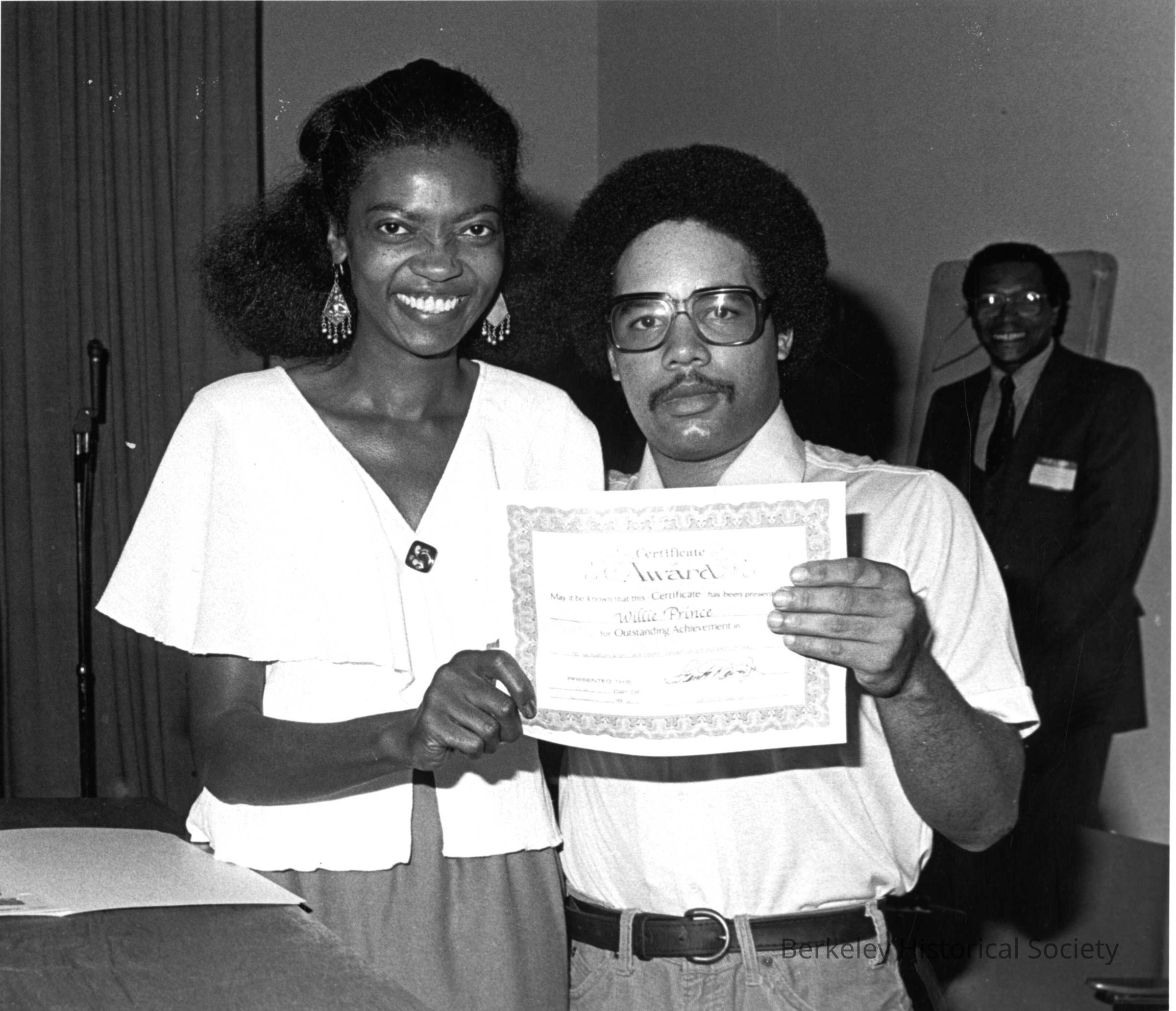 Willie Prince holding up his certificate award. Barbara Lashley poses beside him. Sacramento-Ashby Improvement Association.
