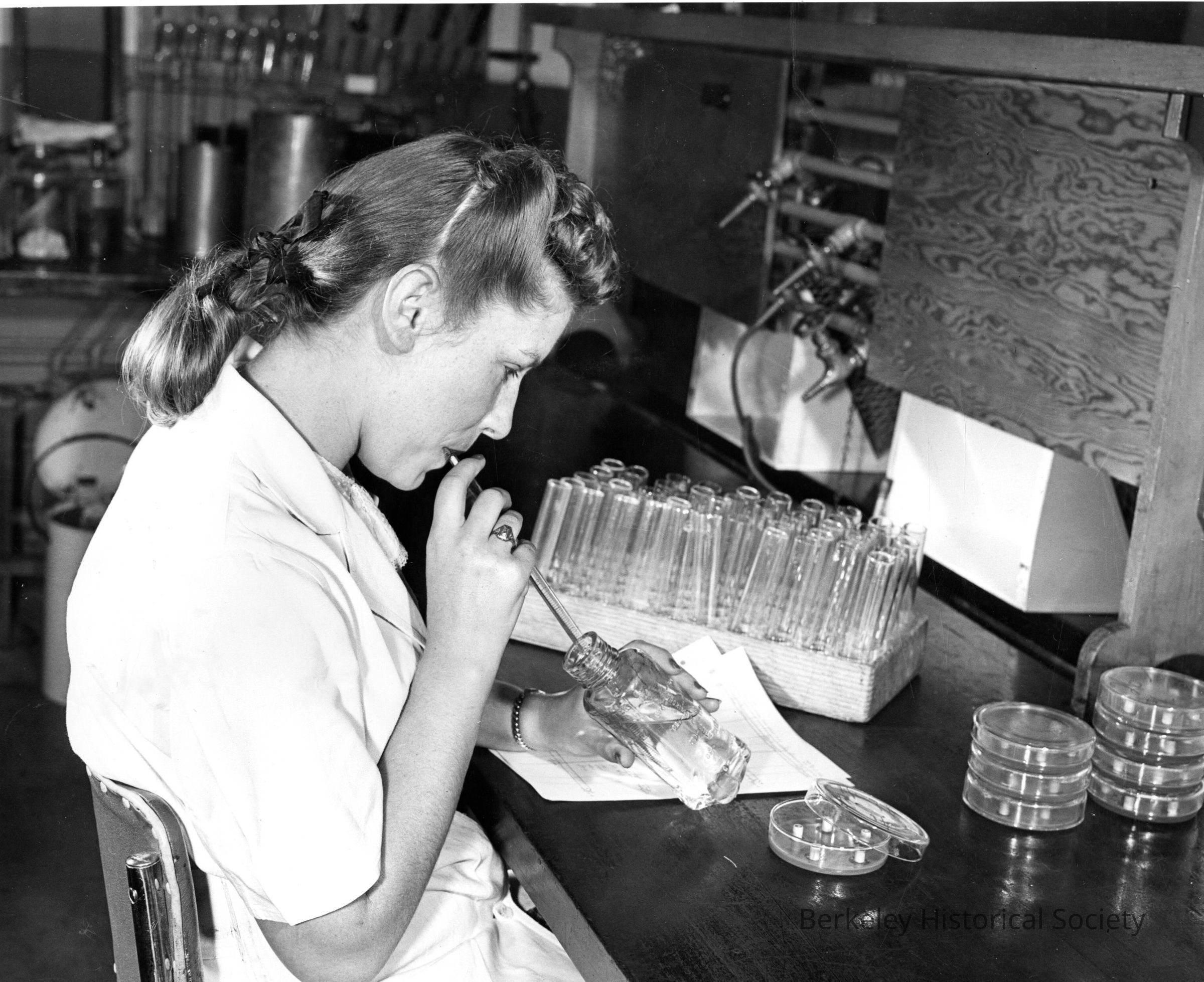 Seated lab technician drawing fluid from bottle. Cutter Laboratories, 4th Street, corner Parker.Made/Created