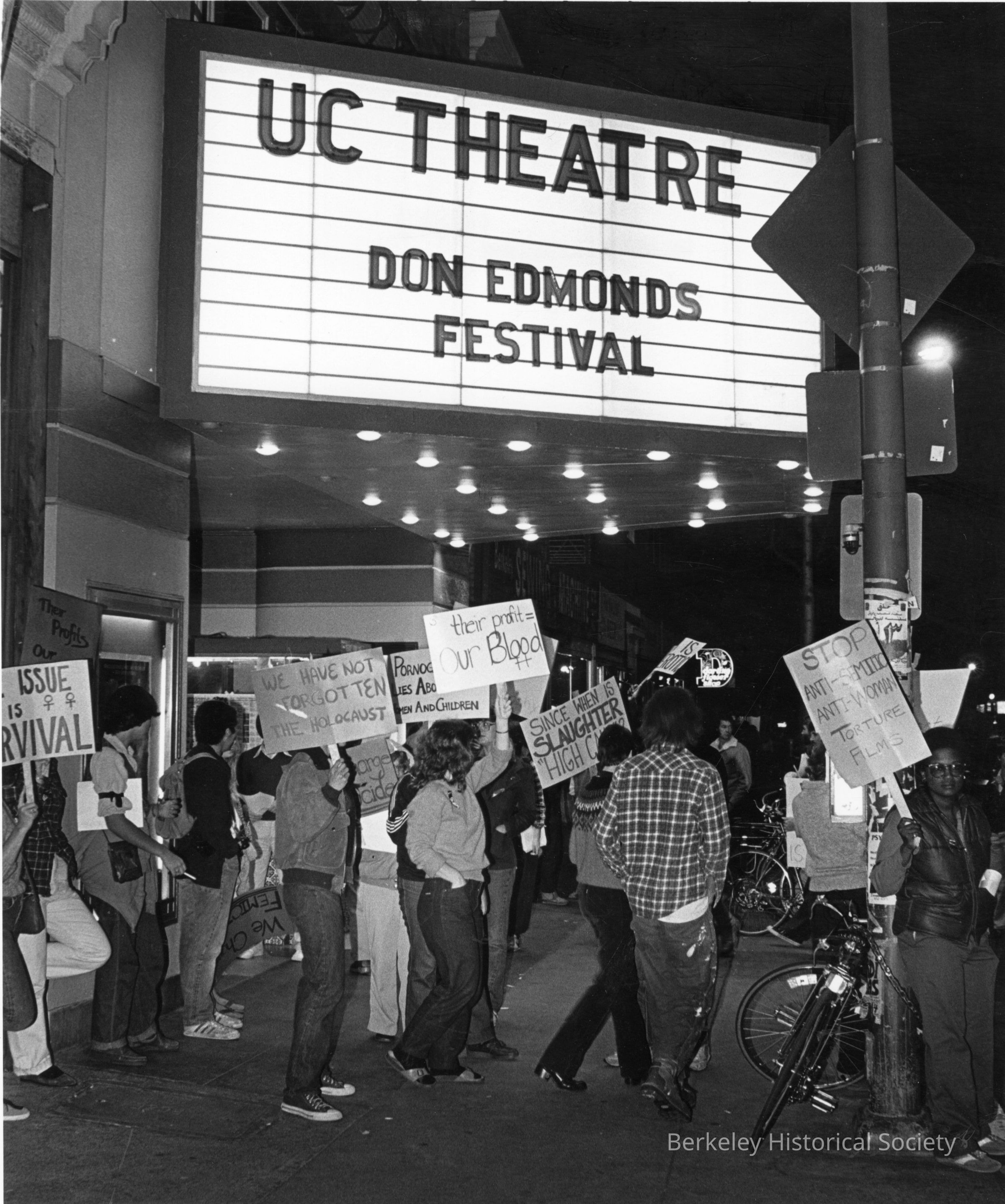 Marchers with placards outside the UC Theatre; Don Edmonds Festival on marquee.