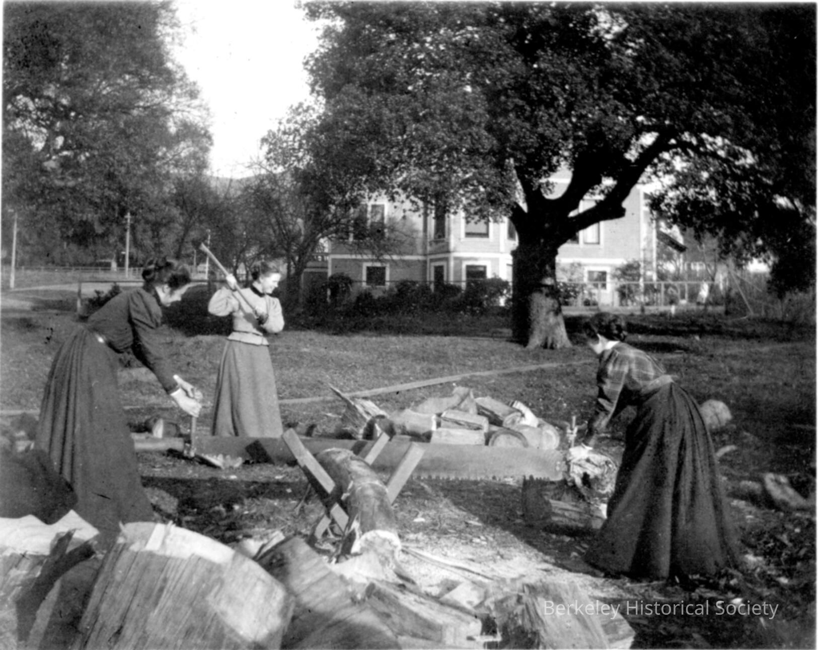 Three women chopping wood in a yard.