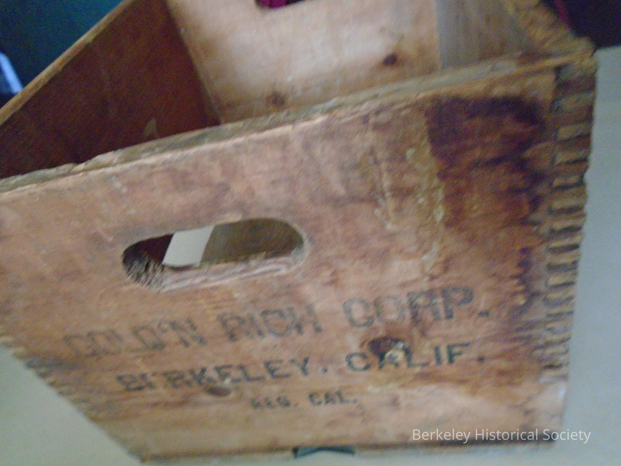 Sturdy, open wood crate with the name Gold'n Rich Corp, Berkeley, Calif. on it. Name is imprinted on each side. Metal strips on one side. Hand slots on each end.Made/Created