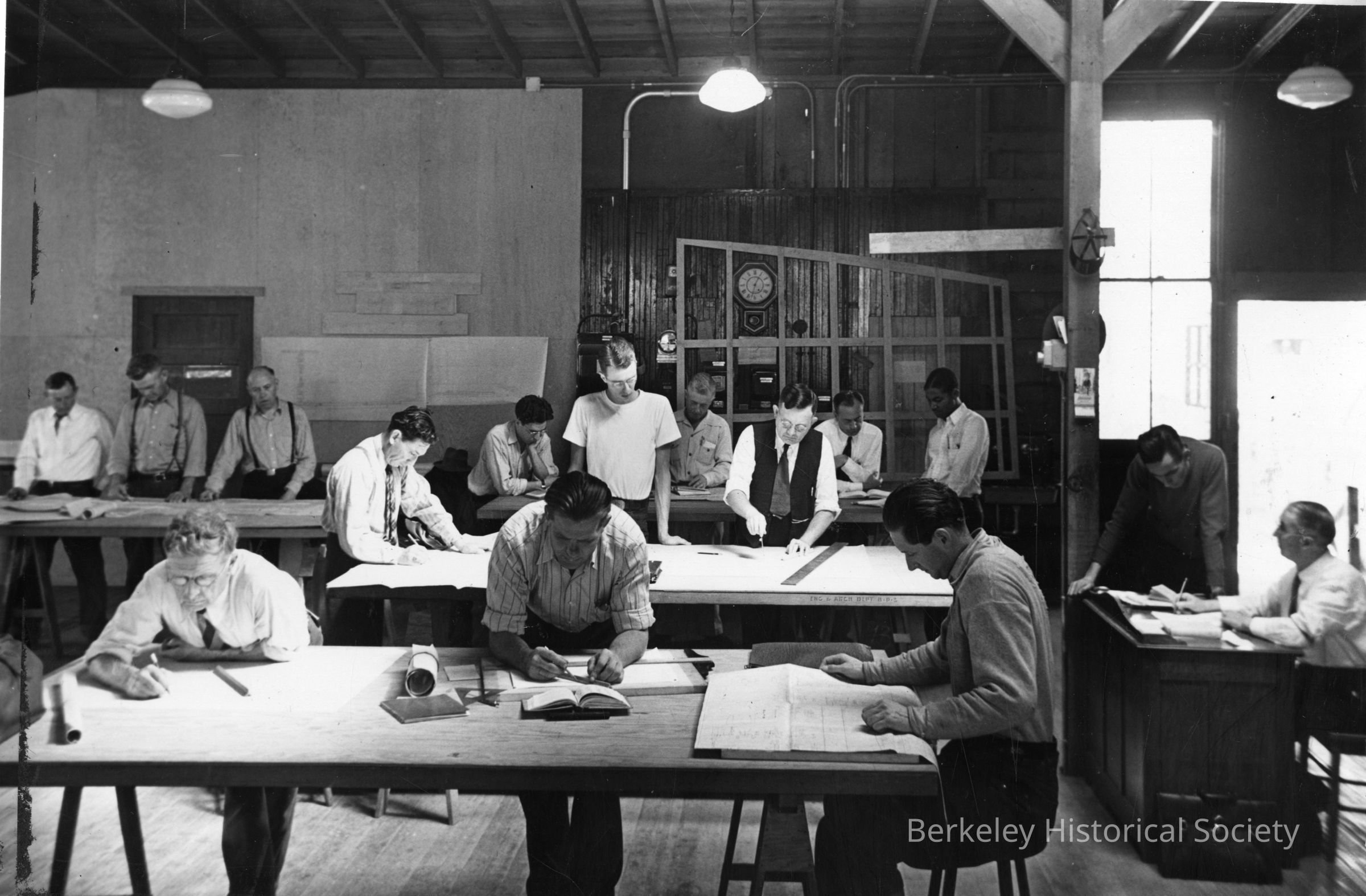 Several men at tables, instructor(?) at desk at right.Other Names and Numbers