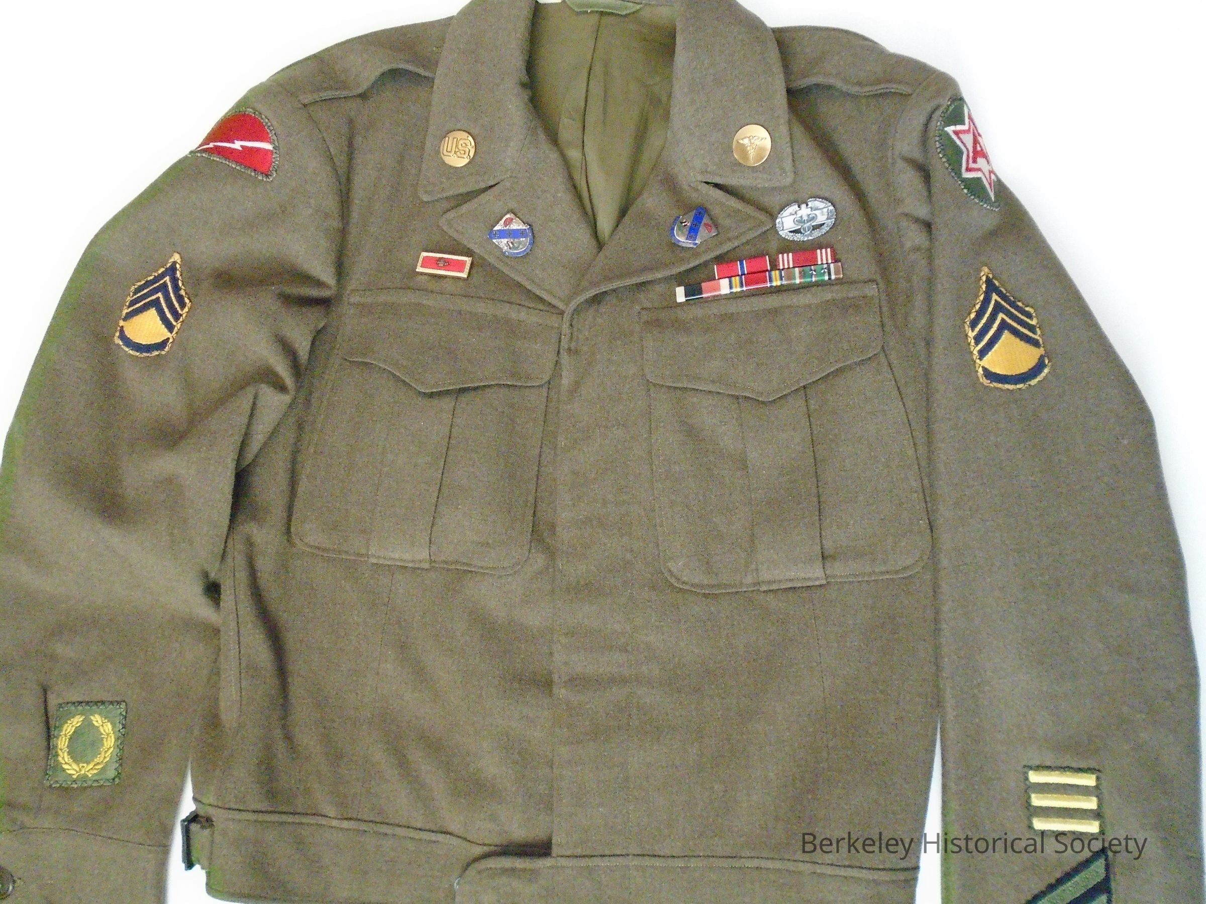 Patches left sleeve: Star with A =6th Army; Chevron gold & navy blue=Tech Sgt., "T" not available; 3 gold stripes=overseas service stripes, 6 mos. each; slanted gold & black stripes=regular enlistment stripes, 3 yrs./ each. Patches right sleeve: Red semicircle with white lightning streak=78th Lightning Division; Chevron gold & navy blue same as left sleeve; Gold wreath on green=Meritorious service unit citation.