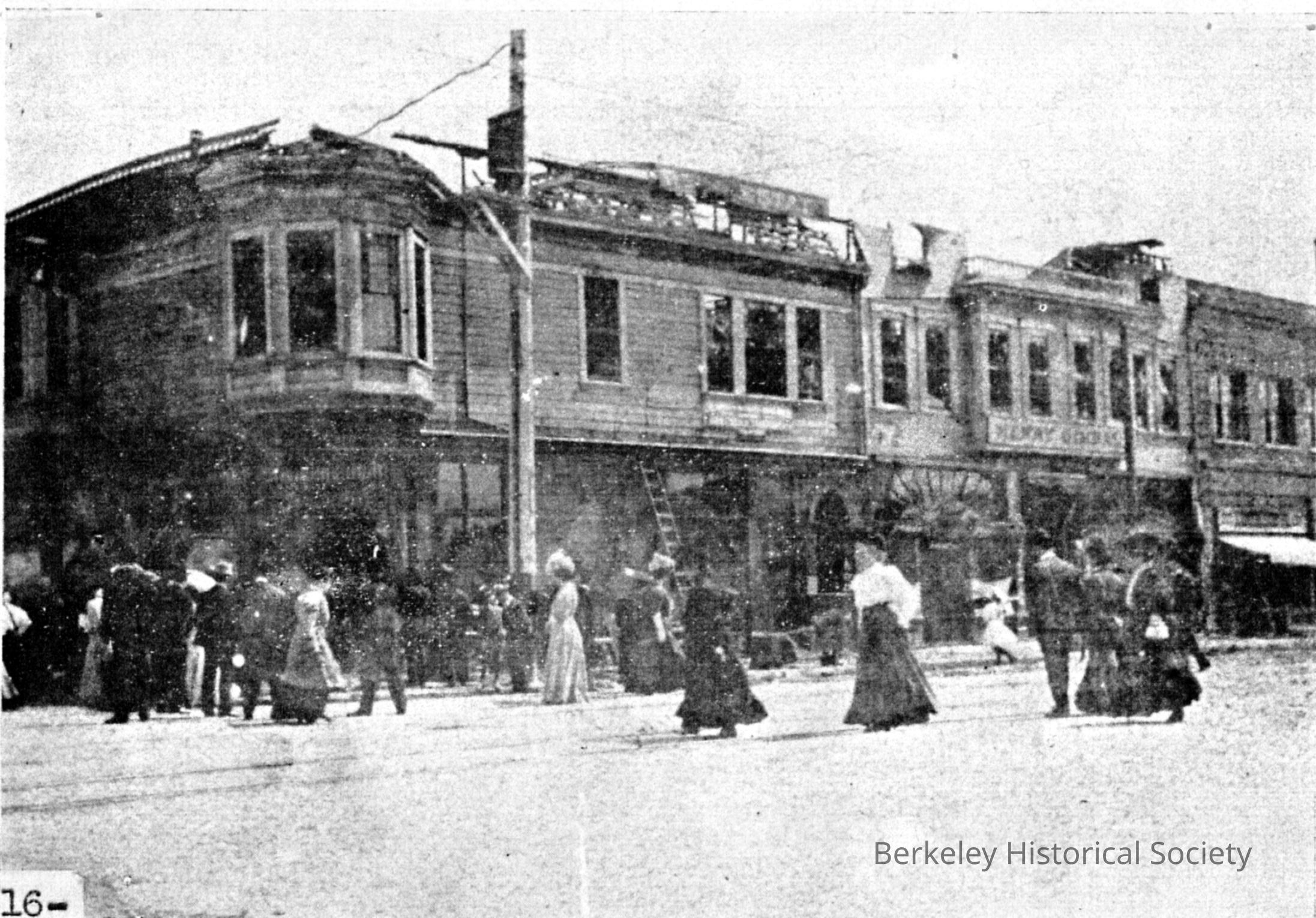 The Wright Block, Center Street and Shattuck Avenue, after fire; many people in street. Reproduction of newspaper photo.