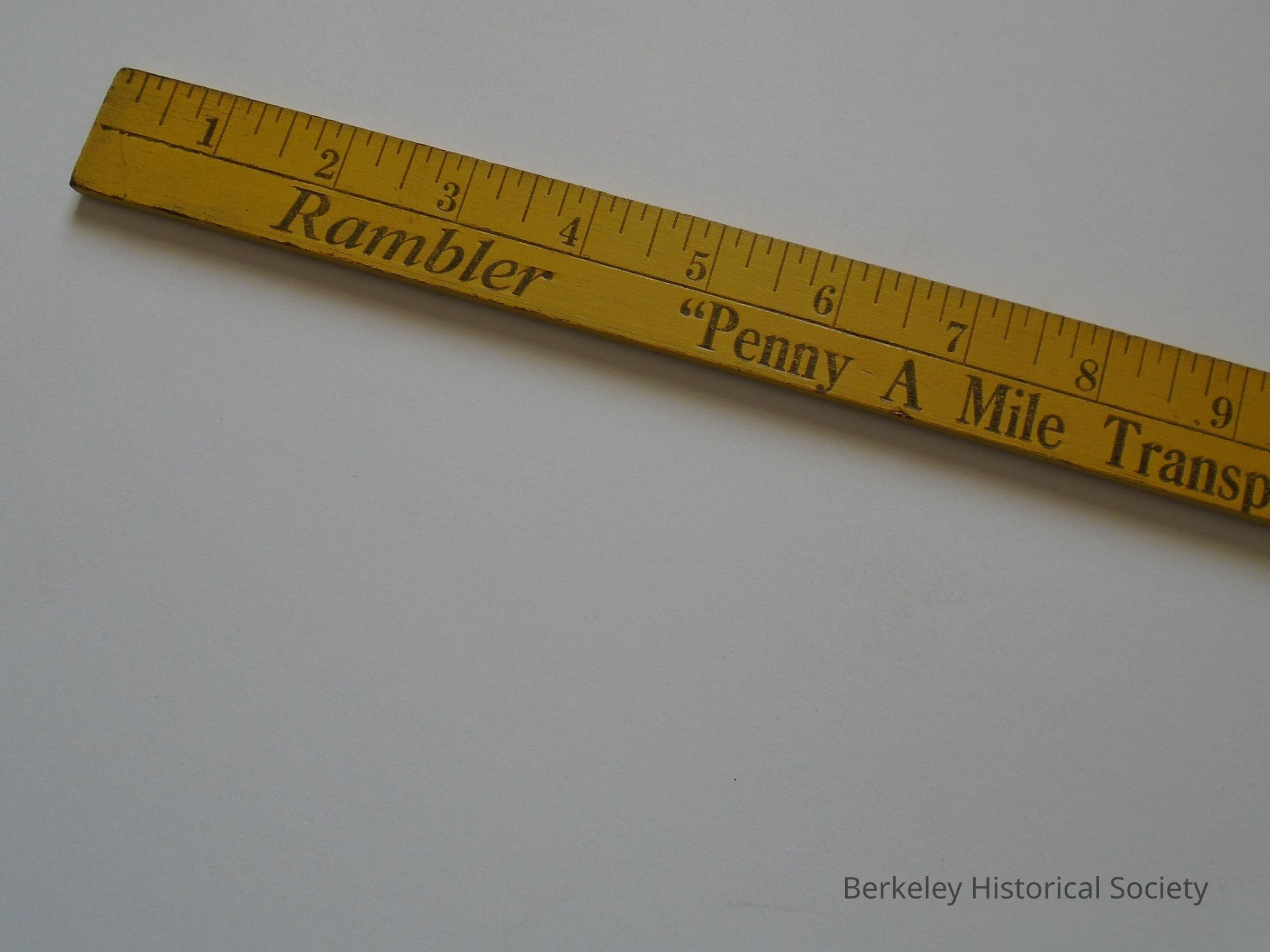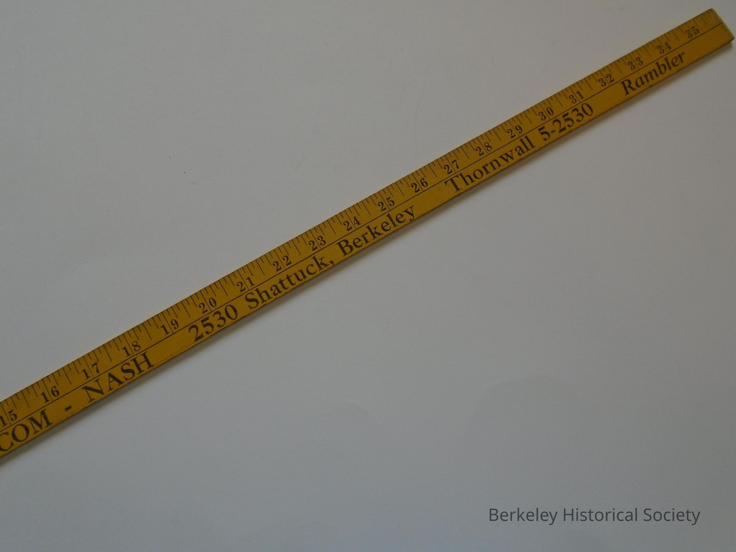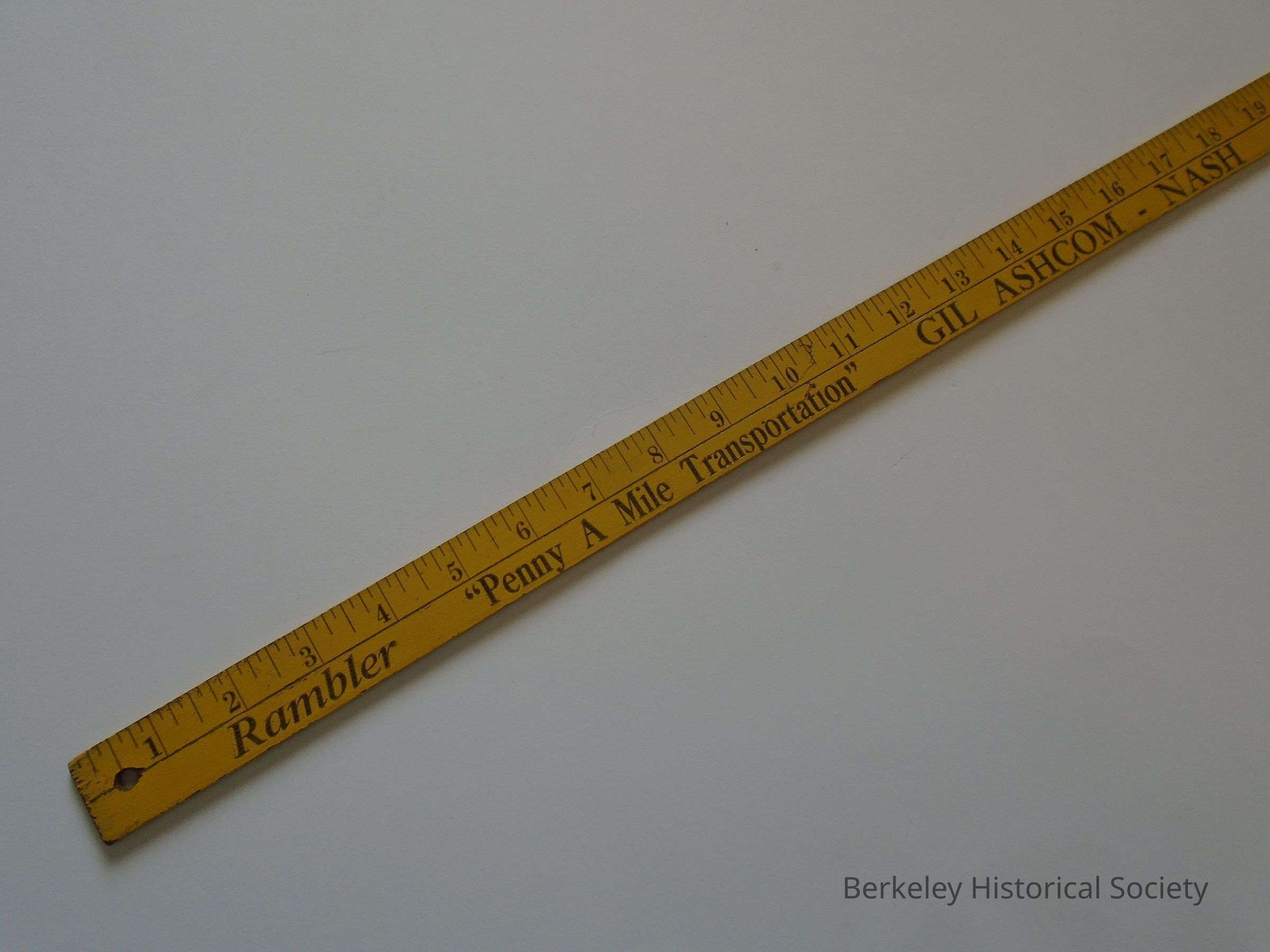 Yellow, wood yardstick. Shows: "Rambler Penny a Mile Transportation GIL ASHCOM - NASH 2530 Shattuck, Berkeley Thornwall 5-2530 Rambler".
