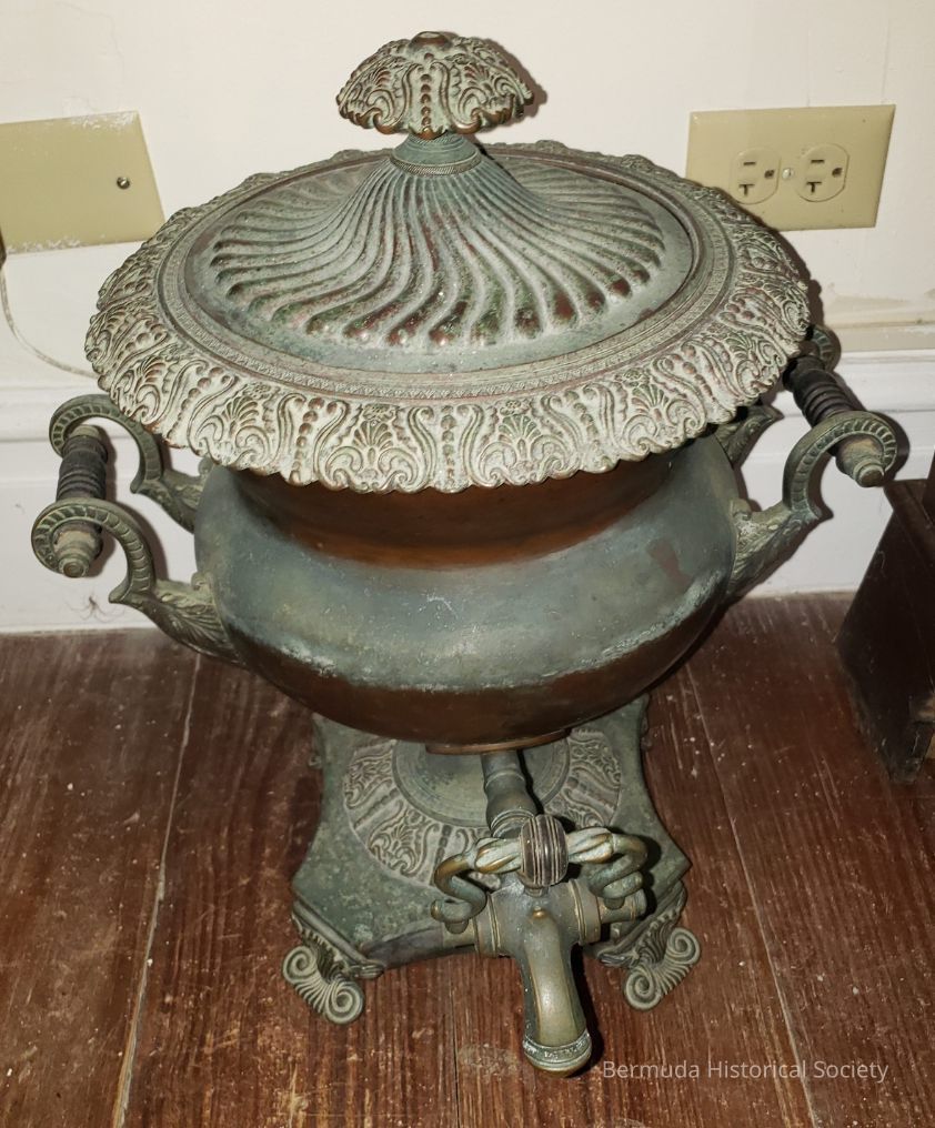 Tea Urn. Bronze, circa 1800. With four-legged base, two handles, removable cover and spigot. Last valued by Colin Cooke (valuation # 56) at $35. From the Stowe family, donated by Miss Bessie Trimingham. B. Hist. S. 08.