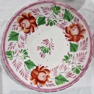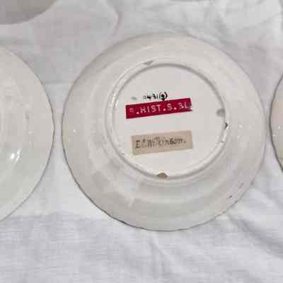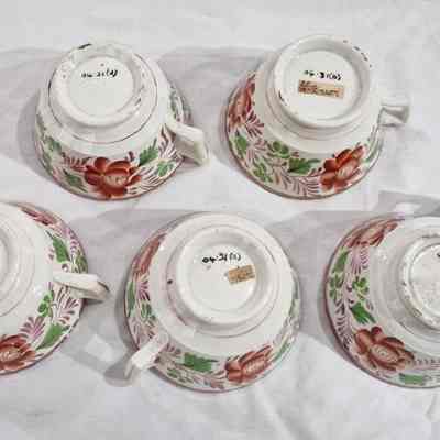1992.04.37 Cups, saucers and slop-bowl. Strawberry or Sunderland luster and red flower design. Comprising five cups, four saucers and slop-bowl. All listed as B. Hist. S. 31.  From Dr. EC Wilkinson.  Several have small chips to foot rims.  #04-31 (h) has clean crack running through it.  Slop bowl has glaze chip at top.