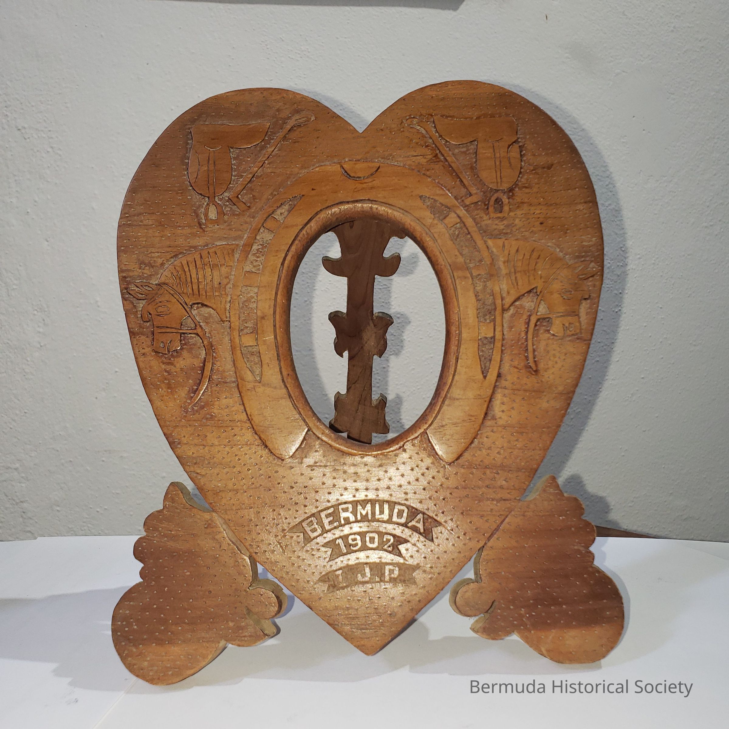 Heart shaped picture frame adorned with horse shoe, saddles and horses. Inscribed BERMUDA 1902 I.J.P.